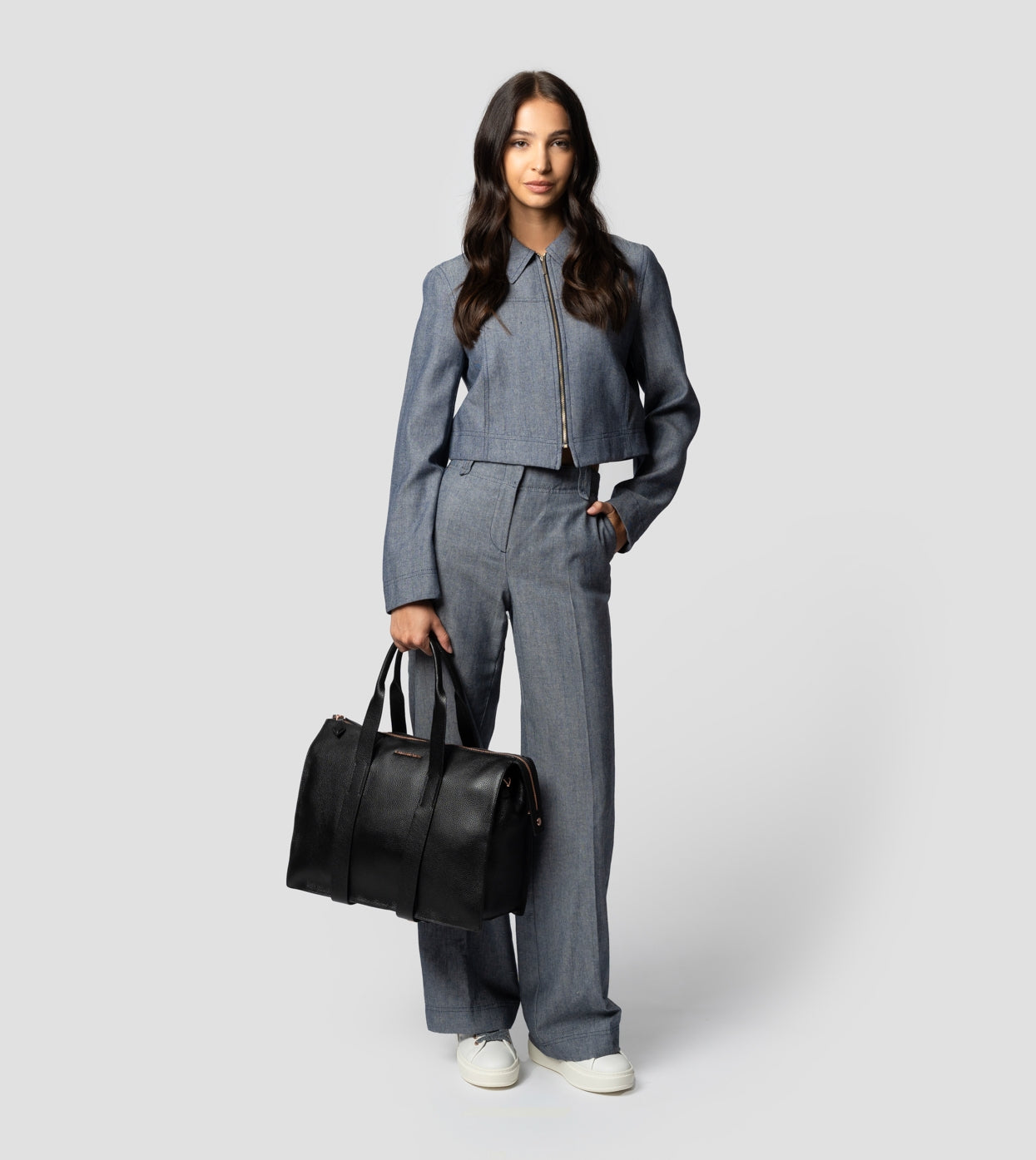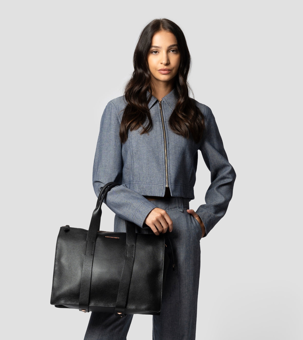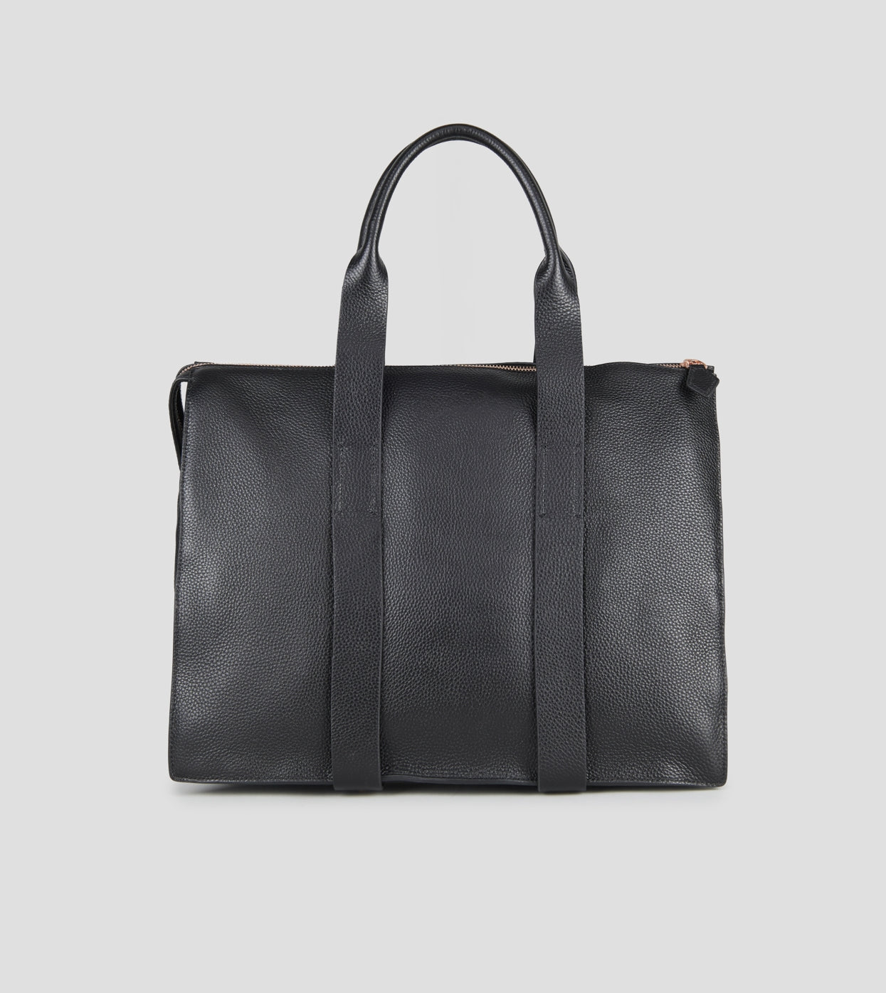 Bauletto di grandi dimensioni realizzato in morbida pelle di vitello pieno fiore. L'articolo ha due comodi manici piu' la tracolla lunga a nastro regolabile e removibile. Le linee essenziali e pulite danno un'identita' stilistica ben precisa alla borsa. Logo e rifiniture metalliche in color rame.