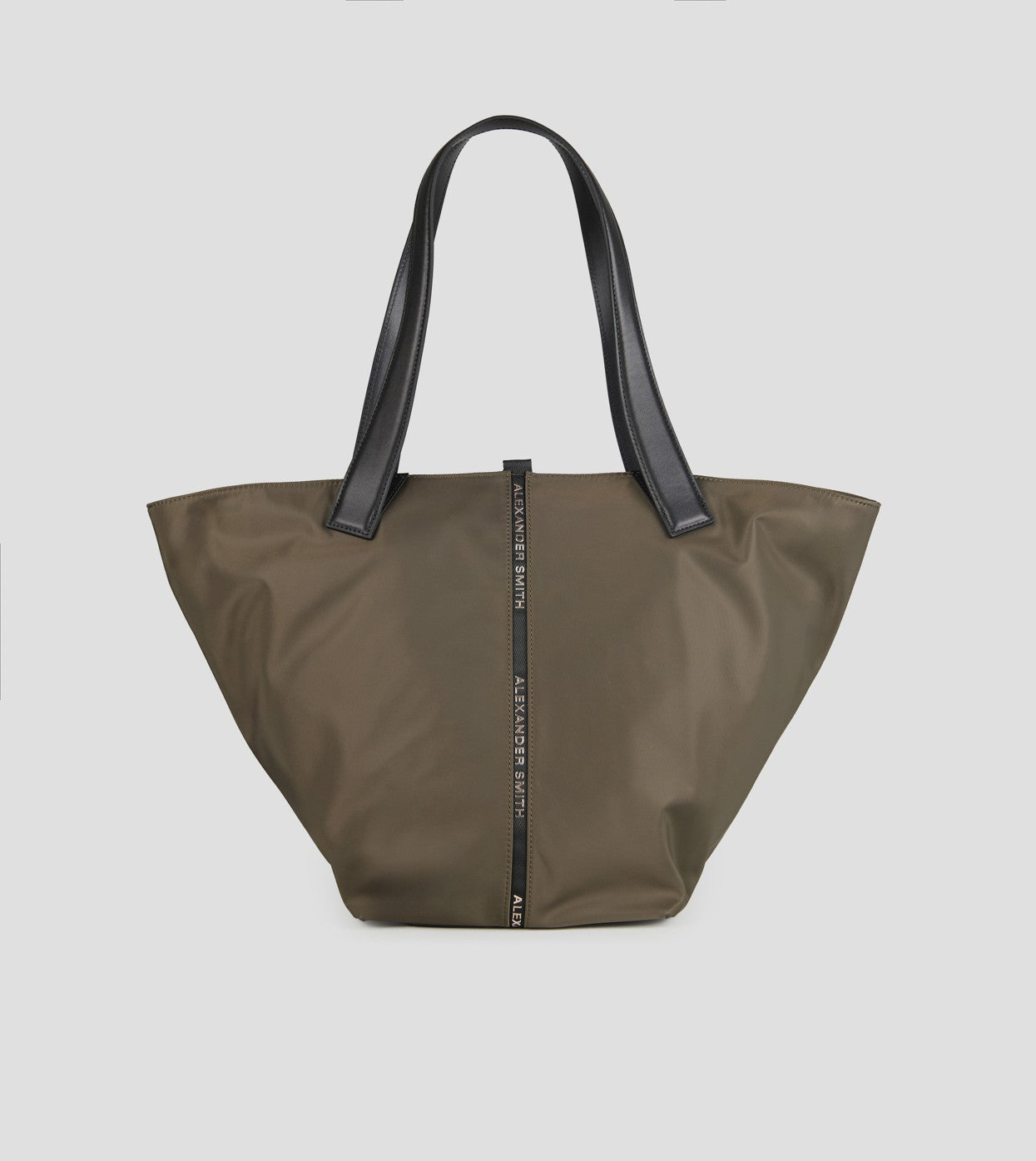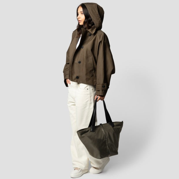 Borsa di grandi dimensioni a forma trapezio, realizzata in resistente e leggero nylon spalmato con manici in pelle in contrasto di colore. Chiusura con cerniera lampo piu' calamita centrale. All'interno fodera in raso e pratica tasca porta oggetti. Gli accessori metallici sono in color oro rosa tipico segno distintivo del brand.