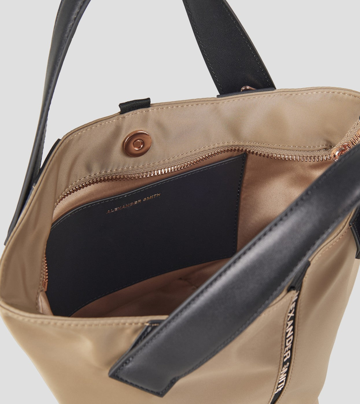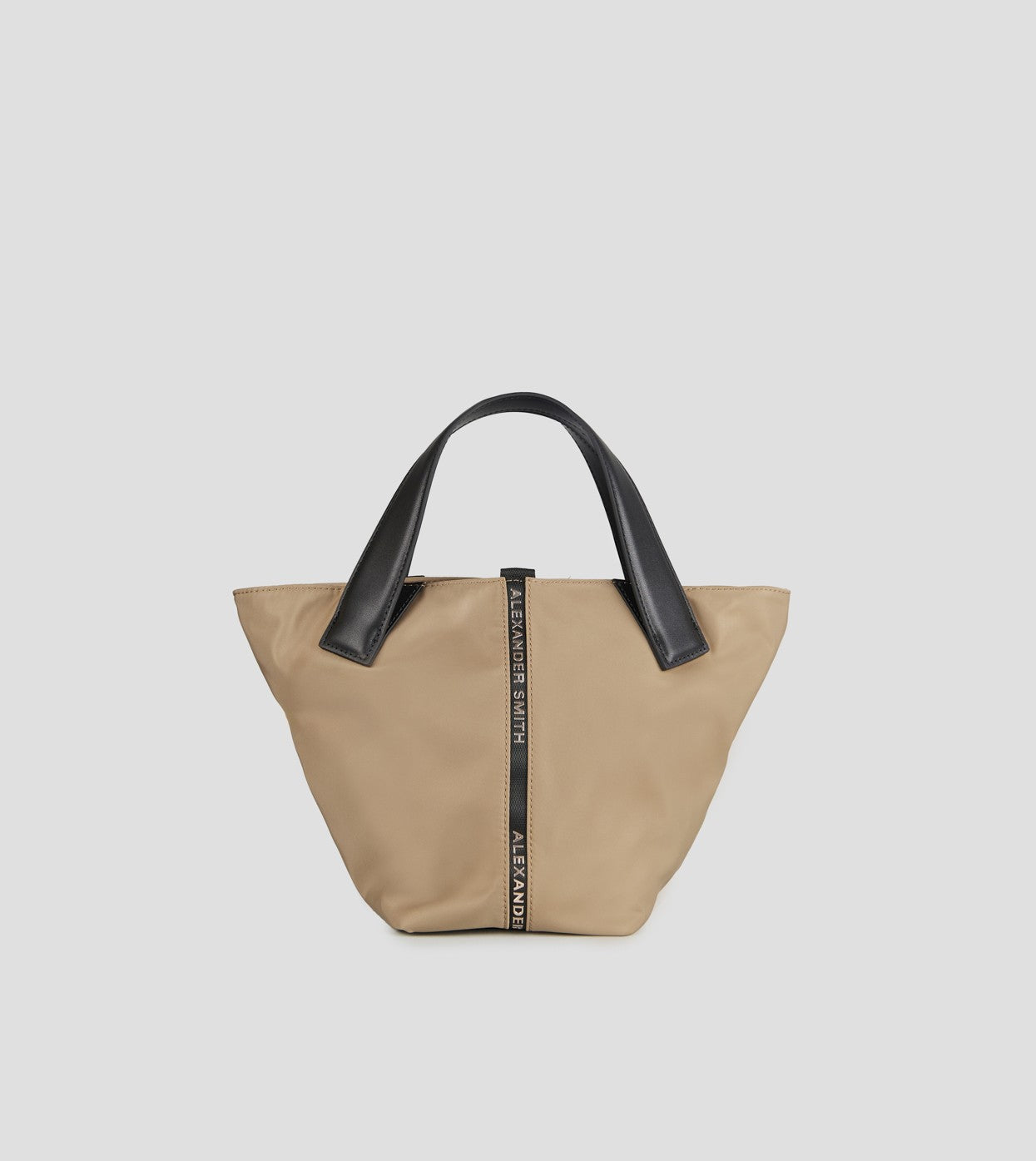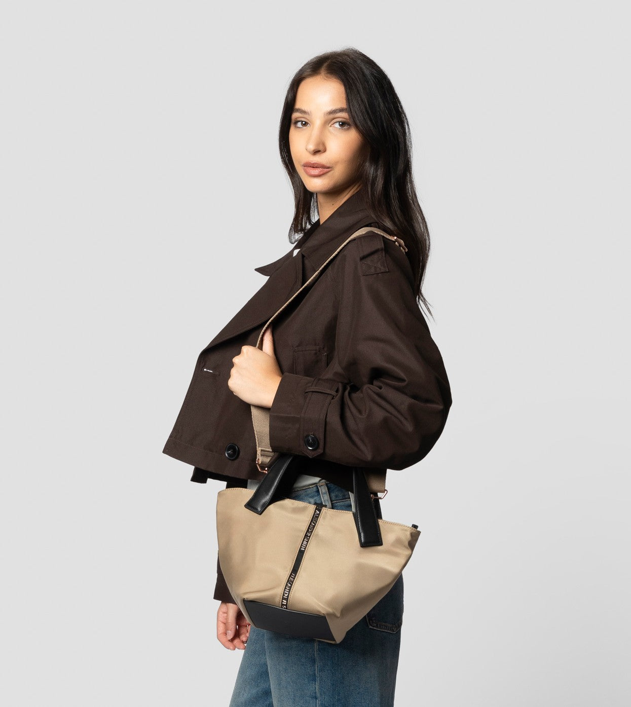 Borsa di piccole dimensioni a forma trapezio, realizzata in resistente e leggero nylon spalmato con manici in pelle in contrasto di colore. Chiusura con cerniera lampo piu' calamita centrale. All'interno fodera in raso e pratica tasca porta oggetti. L'articolo e' dotato anche di comoda tracolla lunga a nasto,regolabile e removibile. Gli accessori metallici sono in color oro rosa tipico segno distintivo del brand.