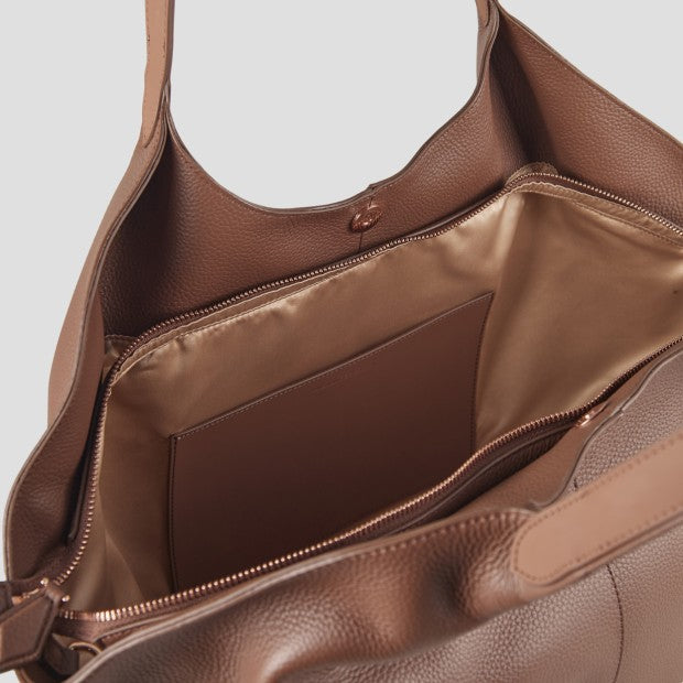 Borsa di grandi dimensioni realizzata in morbida pelle di vitello pieno fiore. L'articolo ha due comodi manici che consentono la perfetta indossabilita' sotto spalla. E' possibile cambiare il modello della borsa (riducendone anche le dimensioni) tramite laccetto con moschettone inserito all'interno.