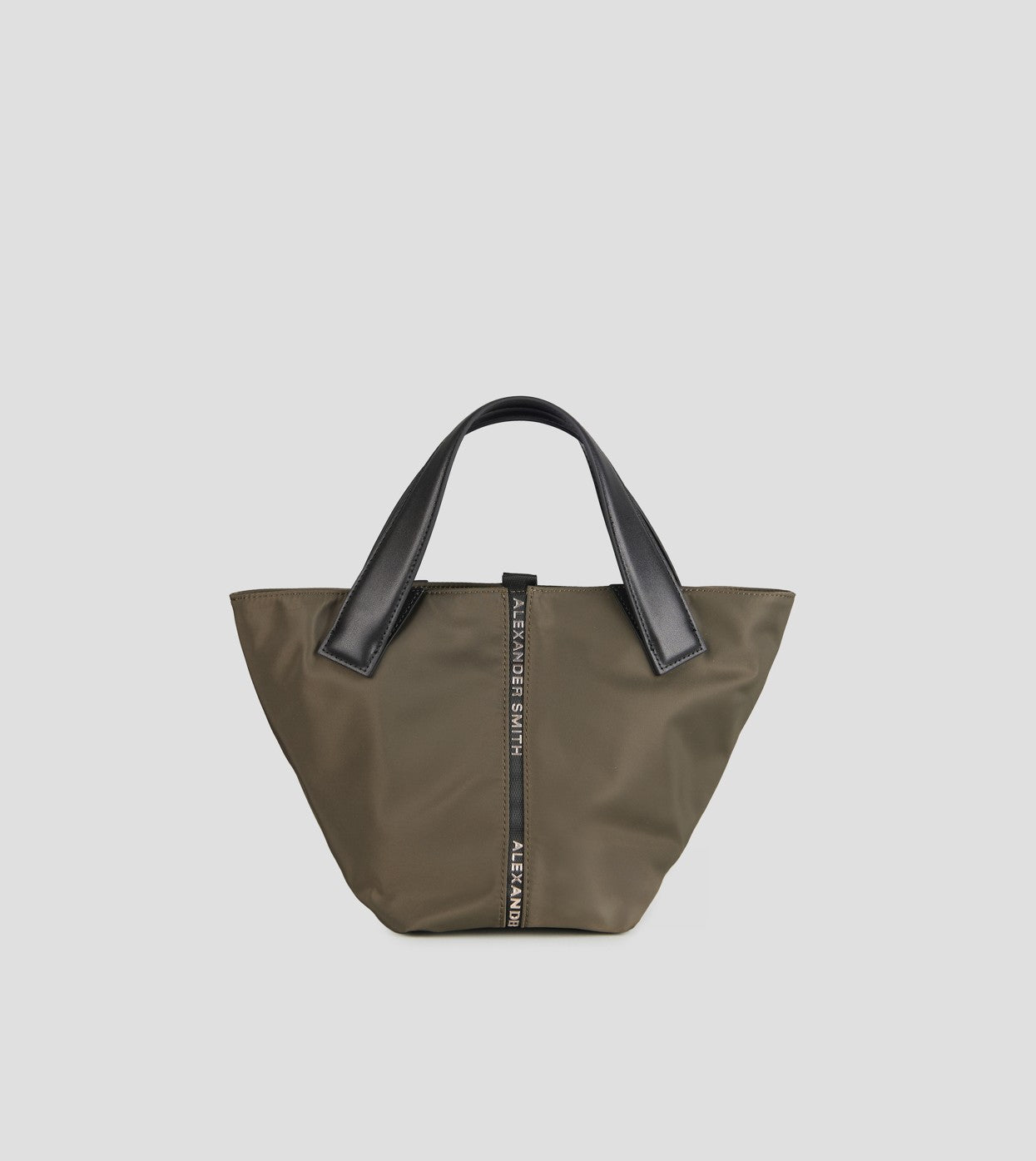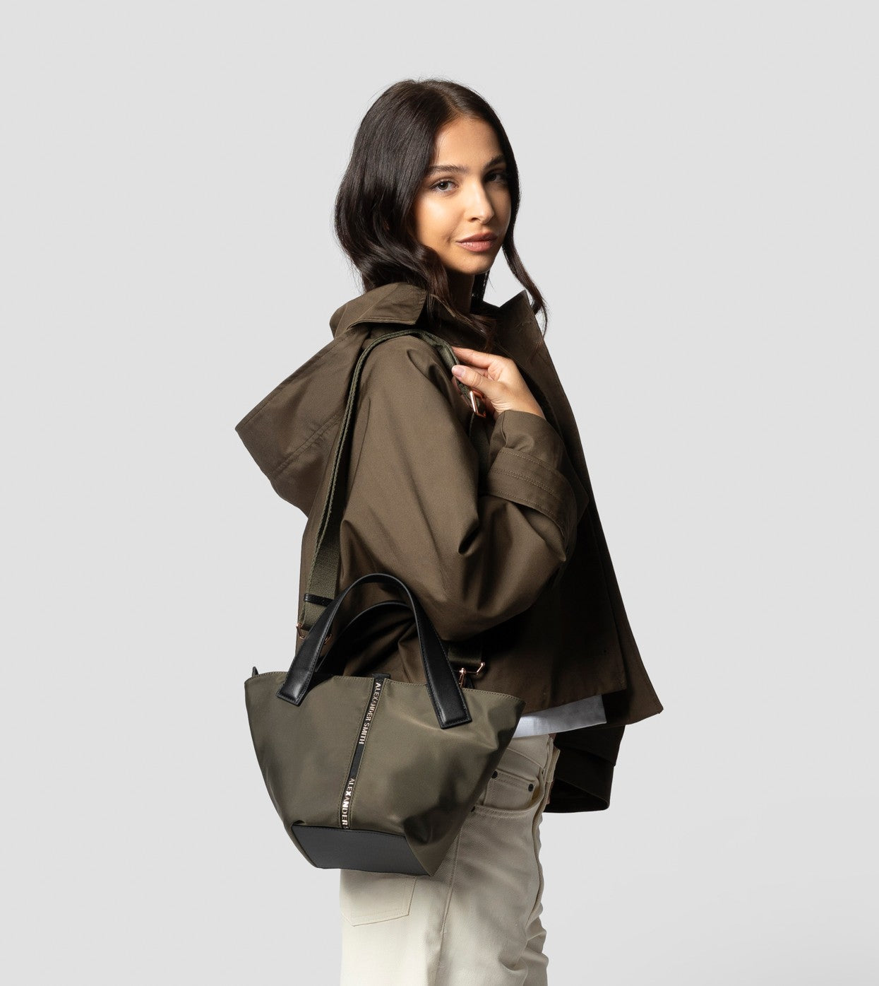 Borsa di piccole dimensioni a forma trapezio, realizzata in resistente e leggero nylon spalmato con manici in pelle in contrasto di colore. Chiusura con cerniera lampo piu' calamita centrale. All'interno fodera in raso e pratica tasca porta oggetti. L'articolo e' dotato anche di comoda tracolla lunga a nasto,regolabile e removibile. Gli accessori metallici sono in color oro rosa tipico segno distintivo del brand.