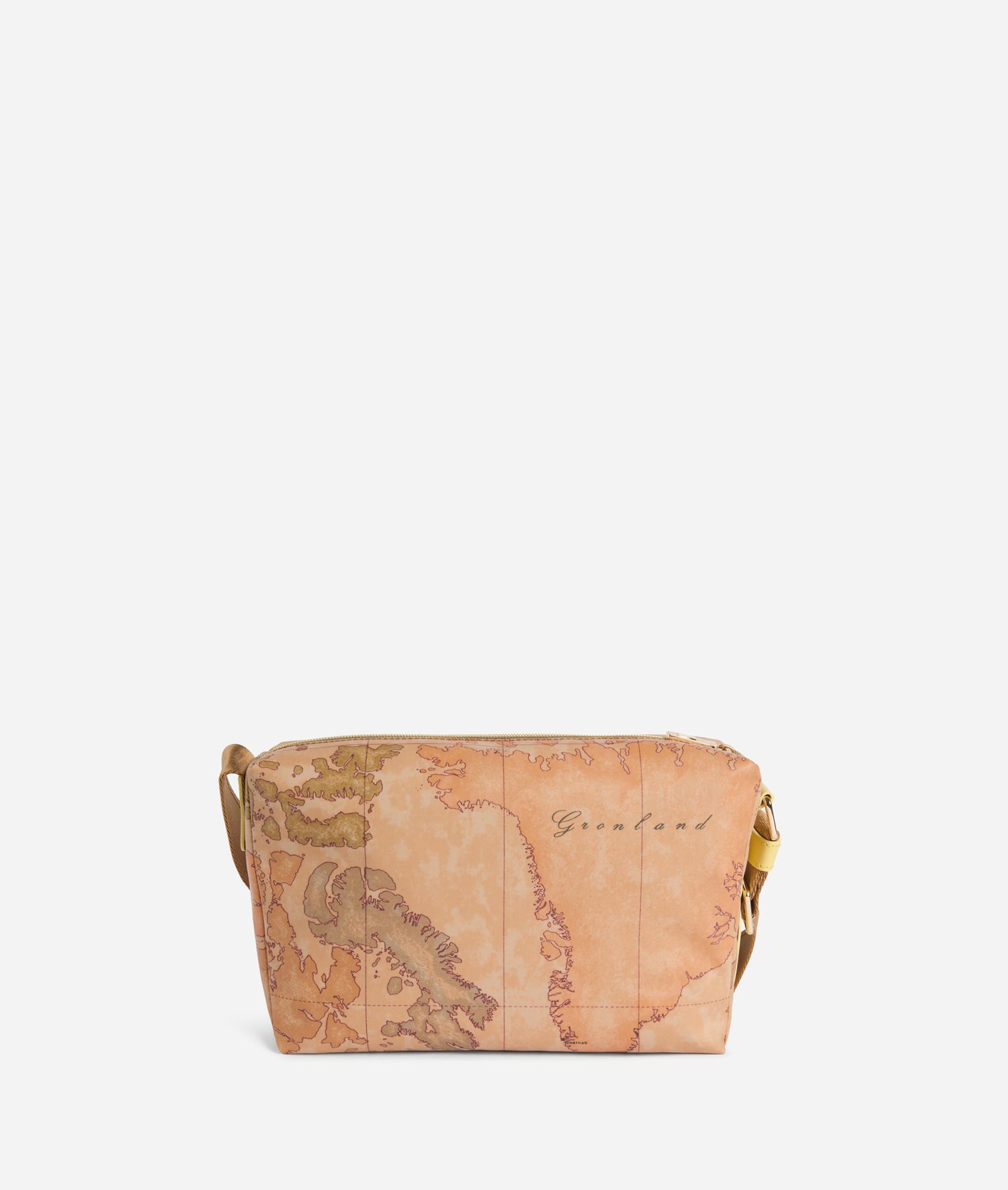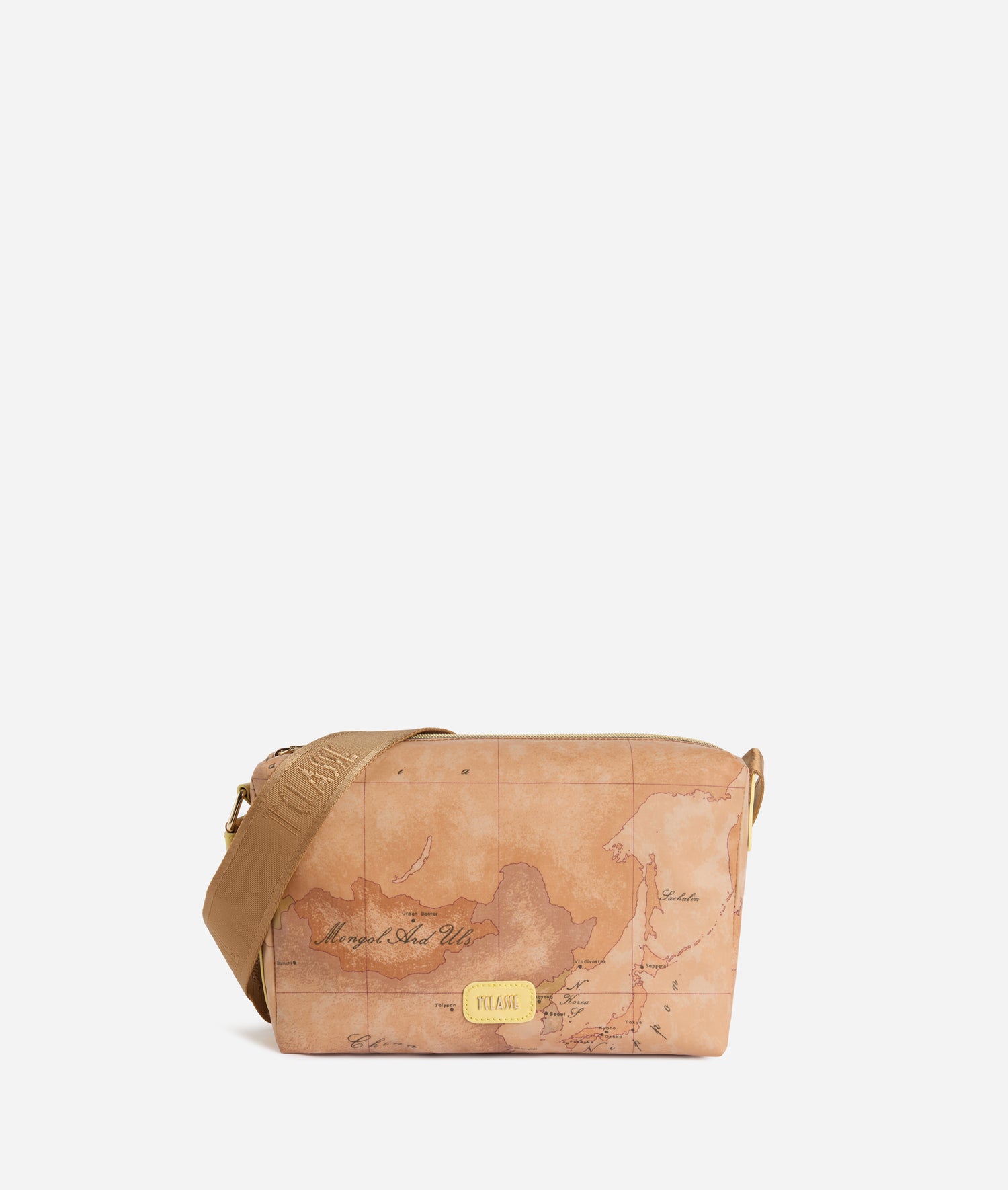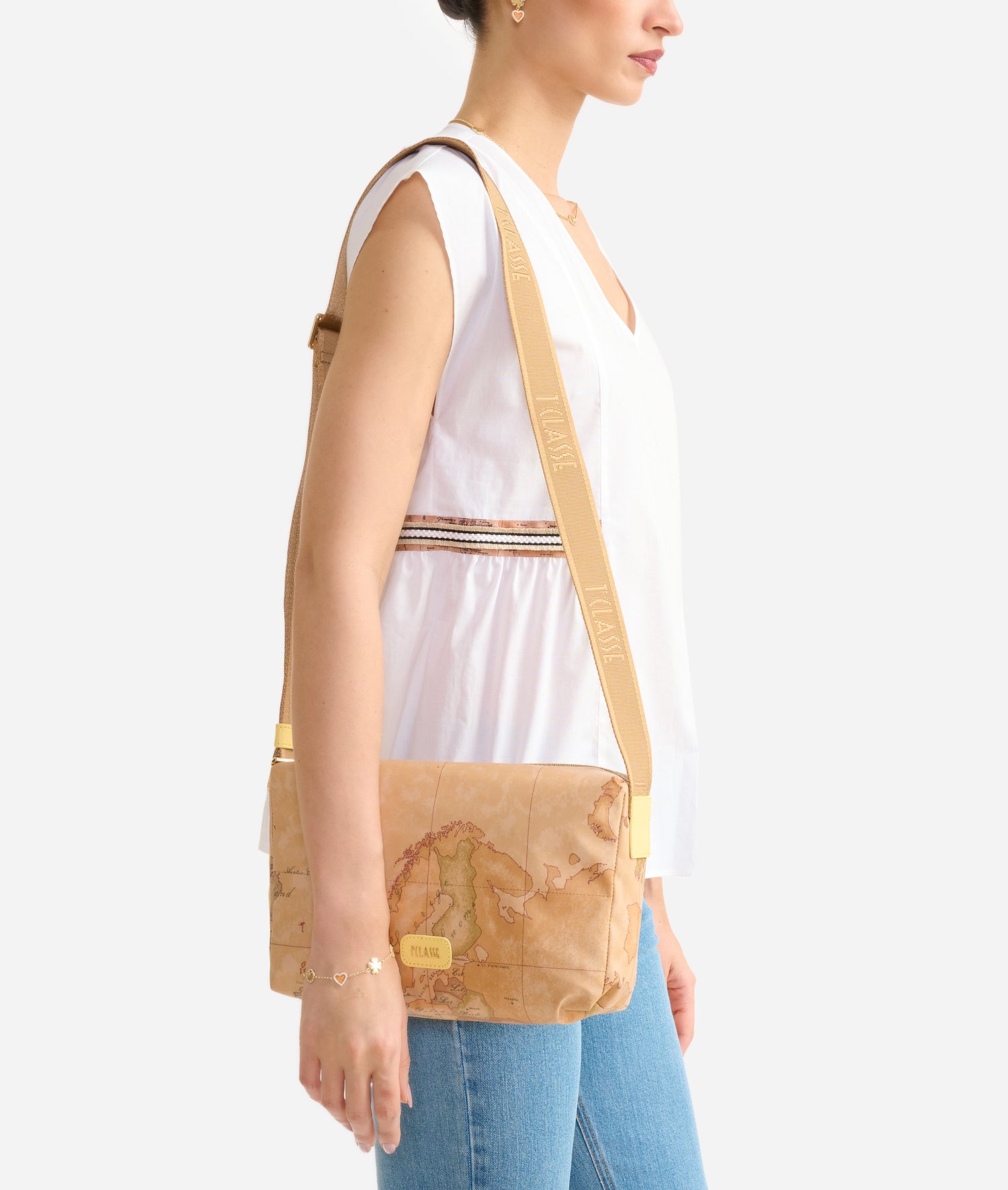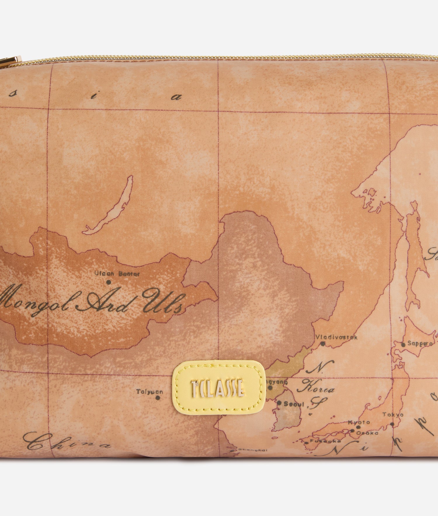 Borsa realizzata in morbido tessuto stampato con cartina geografica Geo SOFT e dettagli in pelle di vacchetta color Giallo.