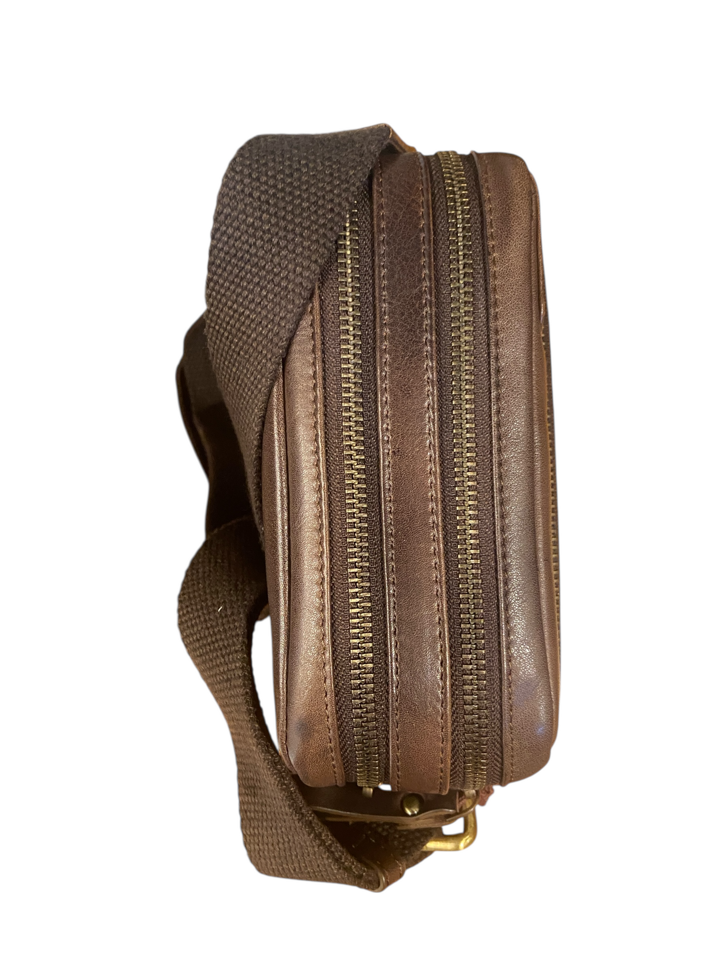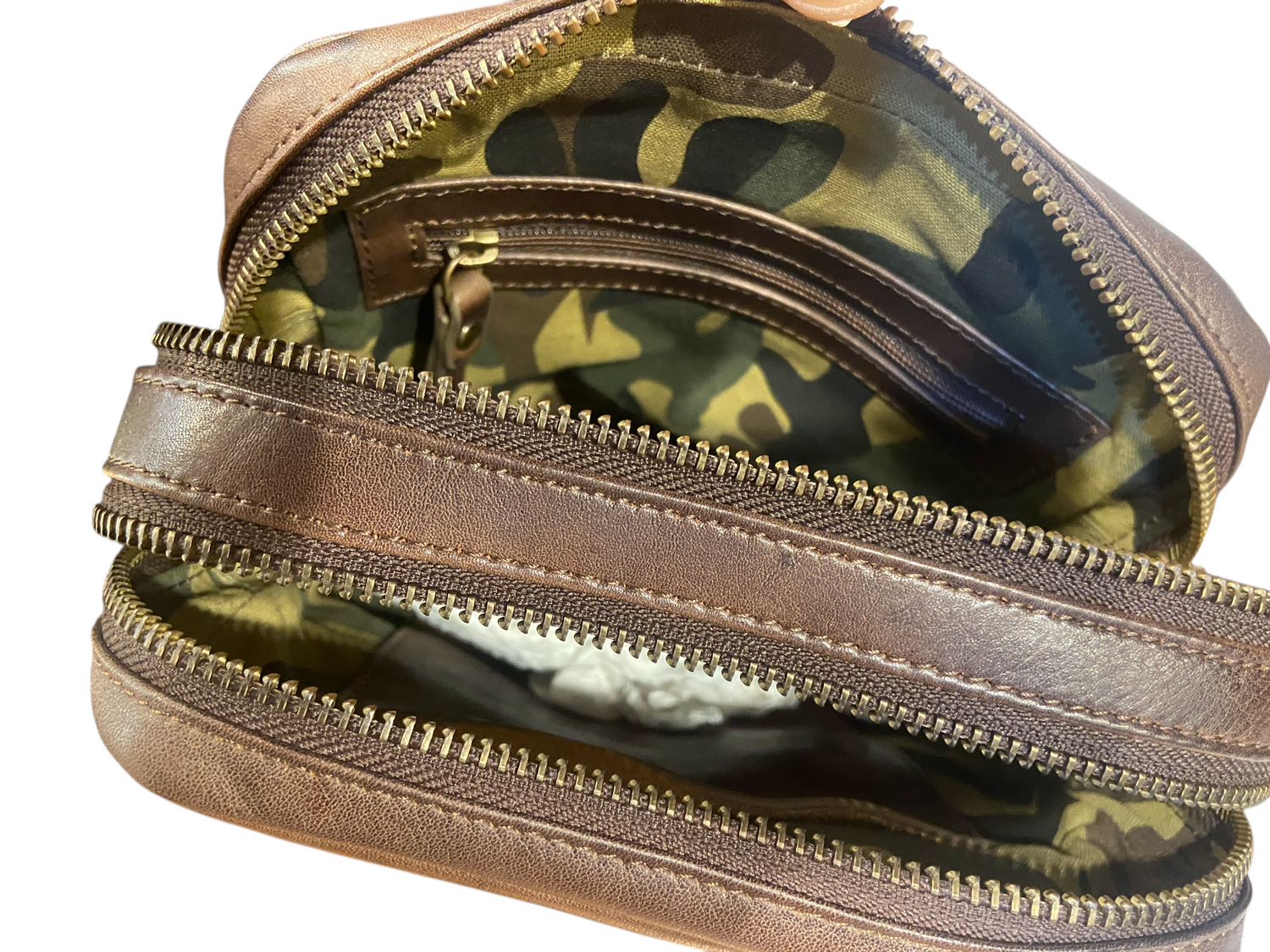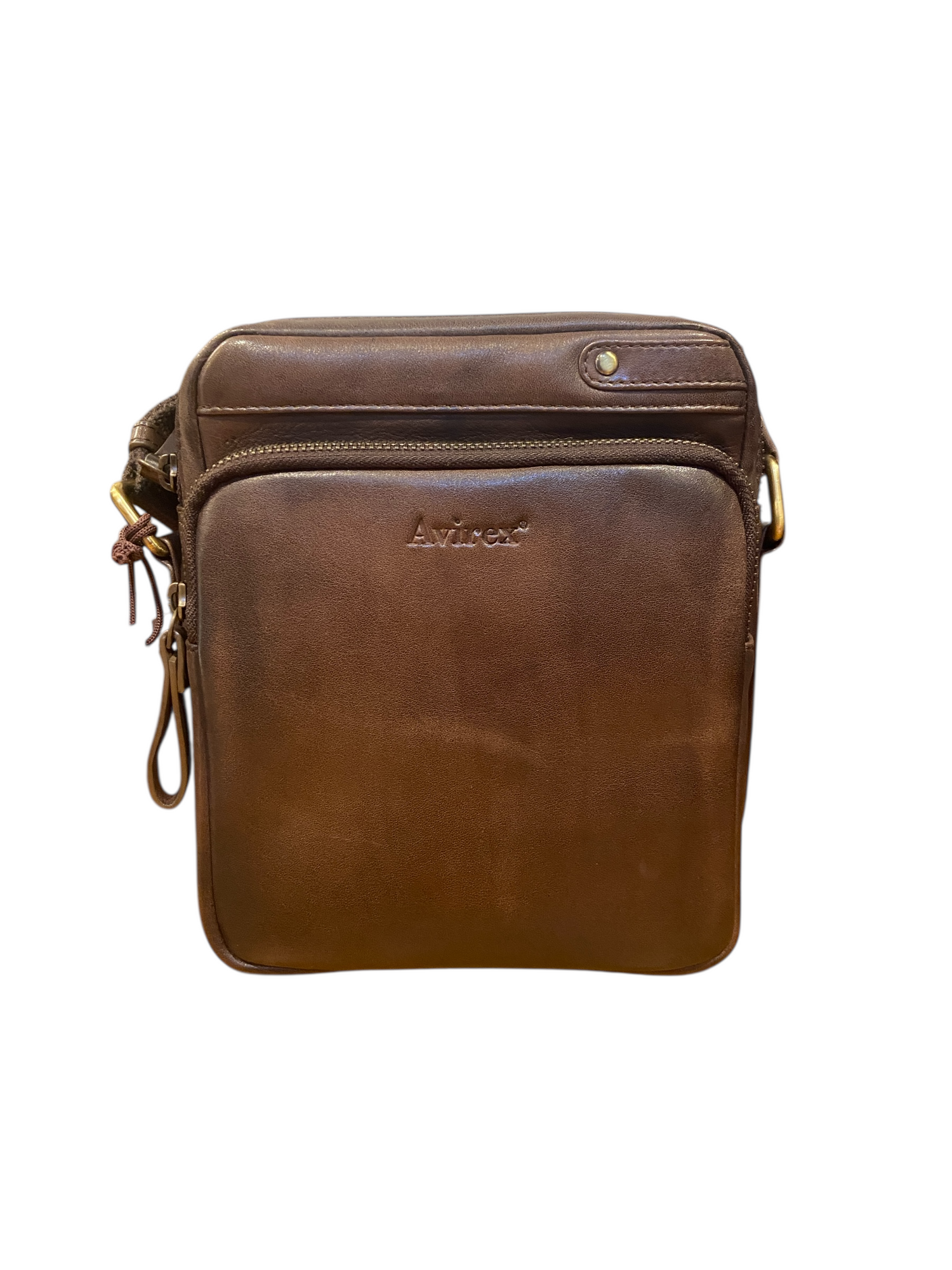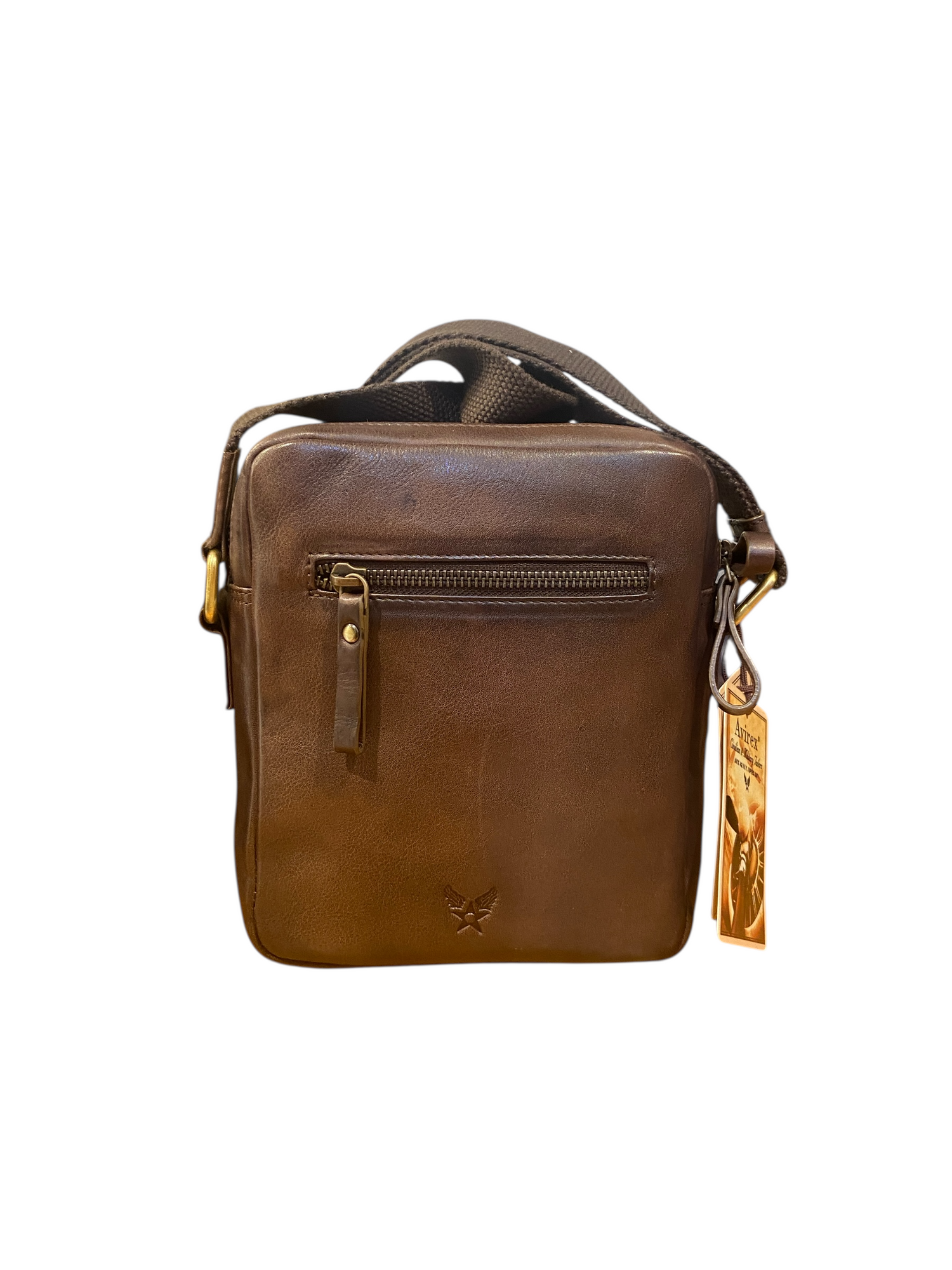 Tracolla realizzata in morbida pelle di vitello tamponata a mano. Due scomparti principali piu' tasca esterna sia frontale che sul retro. All'interno vari spazi organizzati. Accessori metallici in ottone anticato.