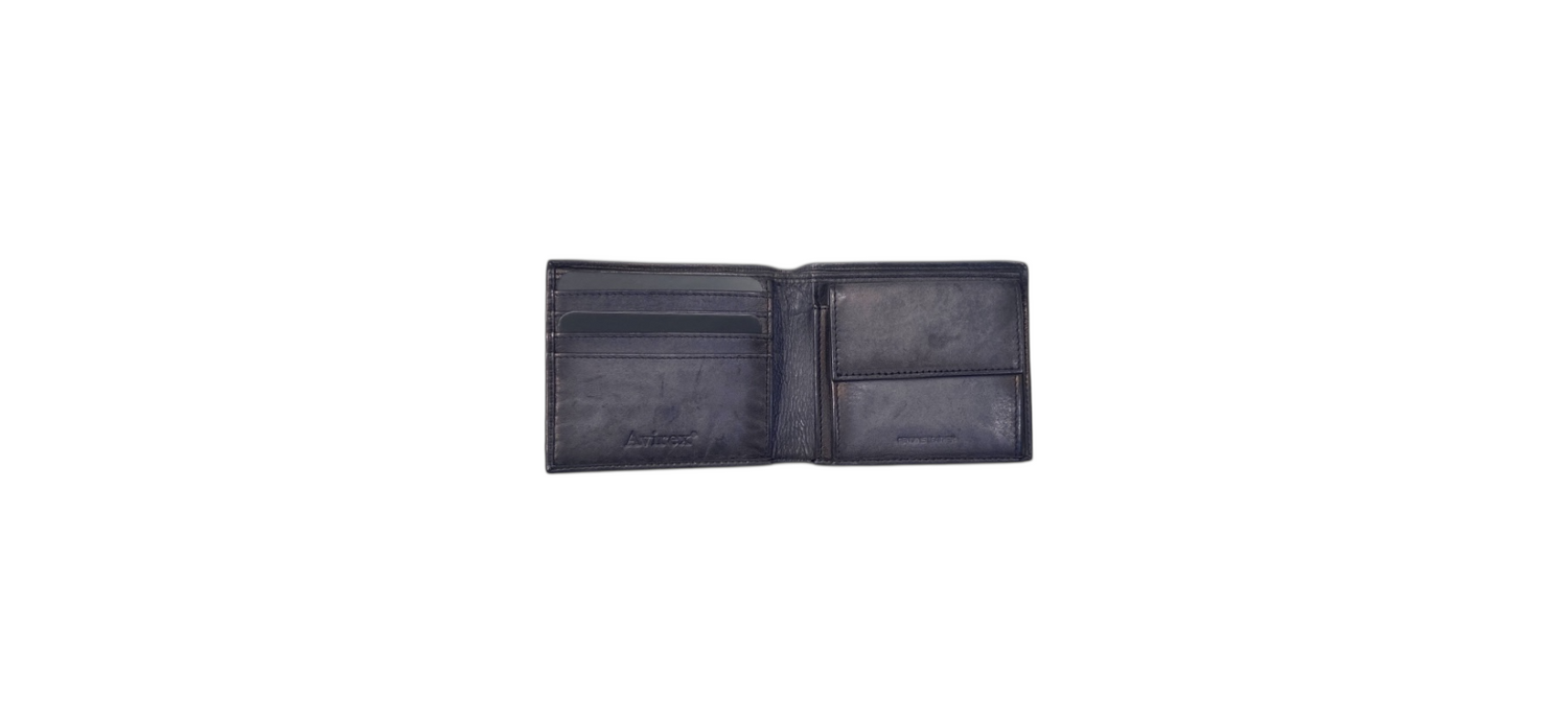 Portaafoglio di piccole dimensioni, realizzato in morbido cuoio dal trattamento "slavato". Quattro slots per carte di credito, 4 tasche per documenti,portamonete e scomparto per banconote.