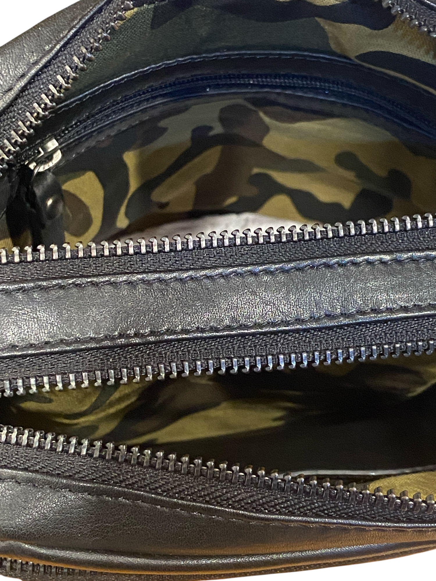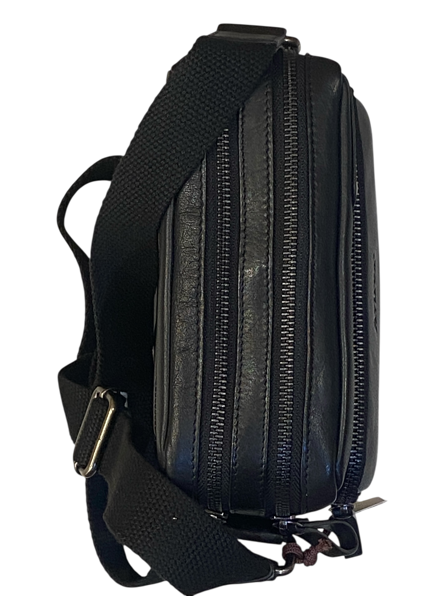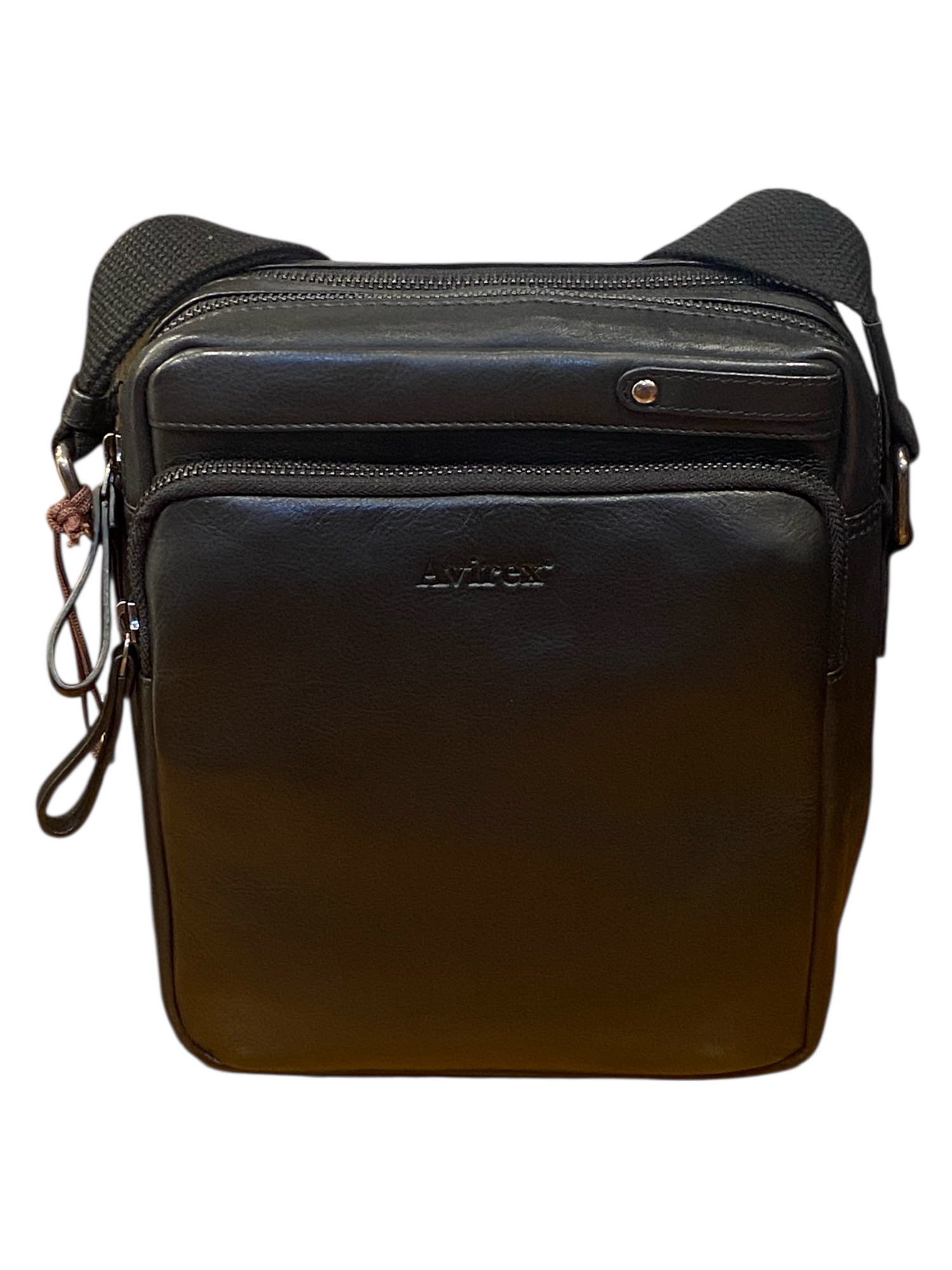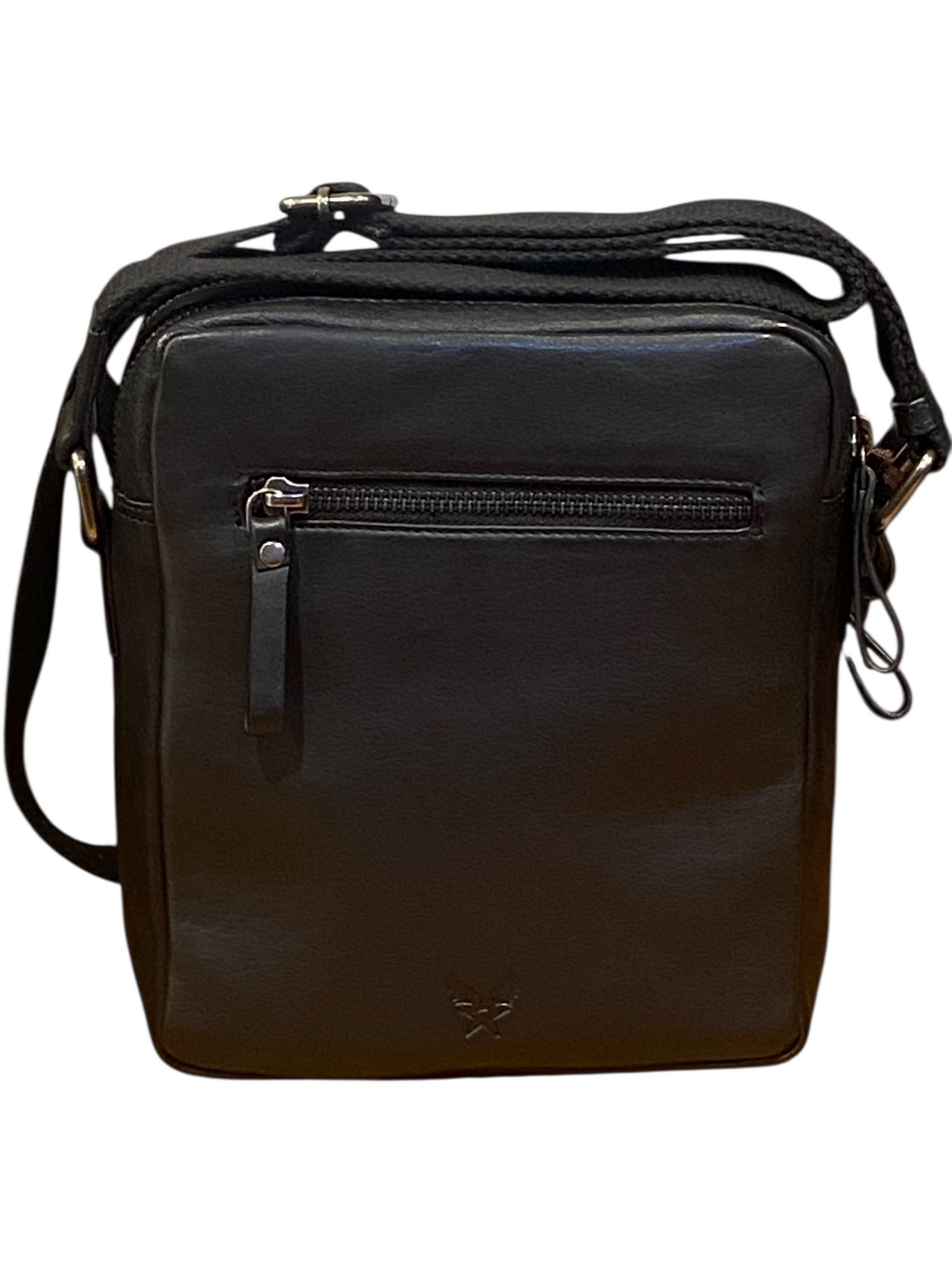 Tracolla realizzata in morbida pelle di vitello tamponata a mano. Due scomparti principali piu' tasca esterna sia frontale che sul retro. All'interno vari spazi organizzati. Accessori metallici in ottone anticato.