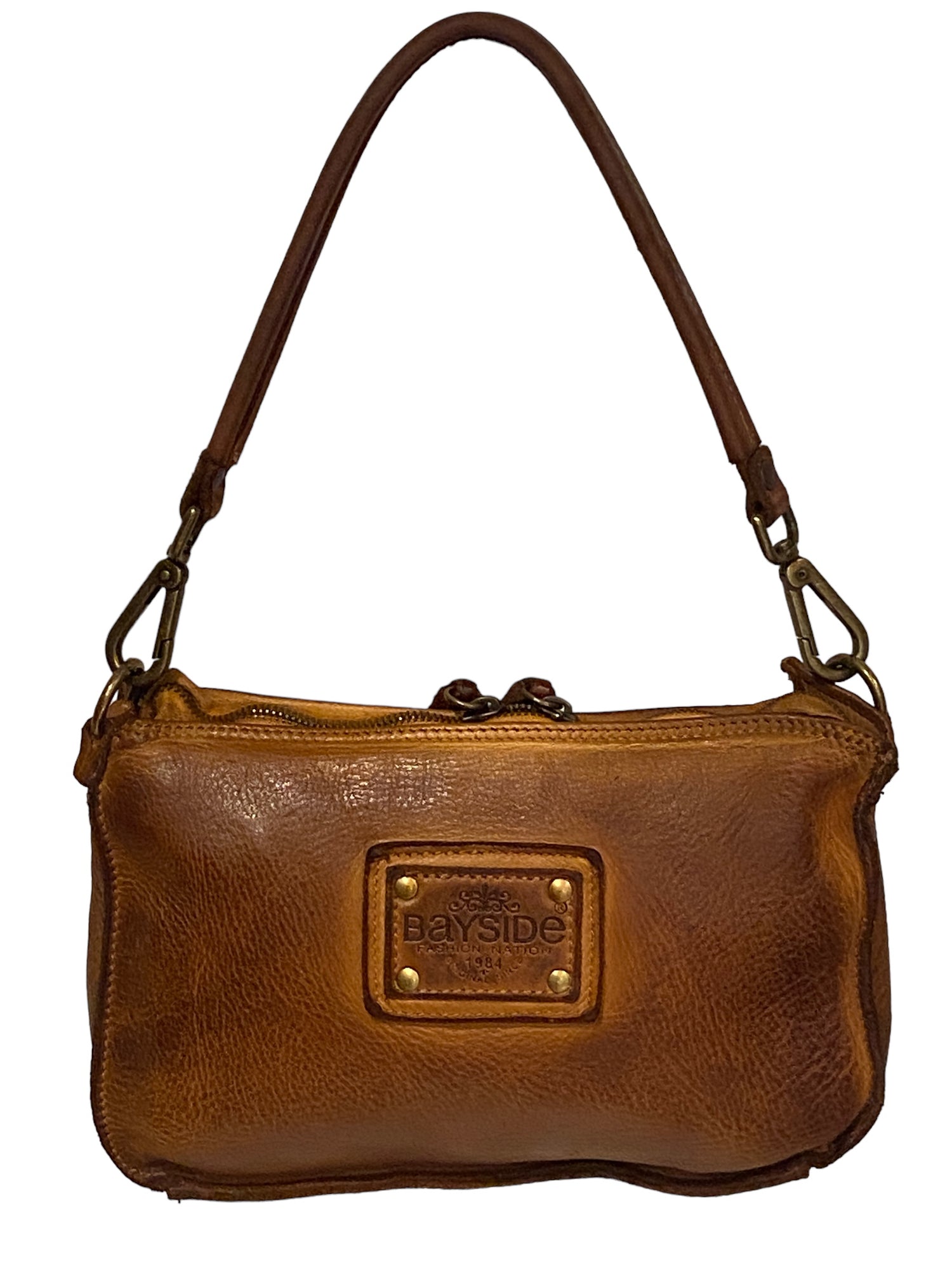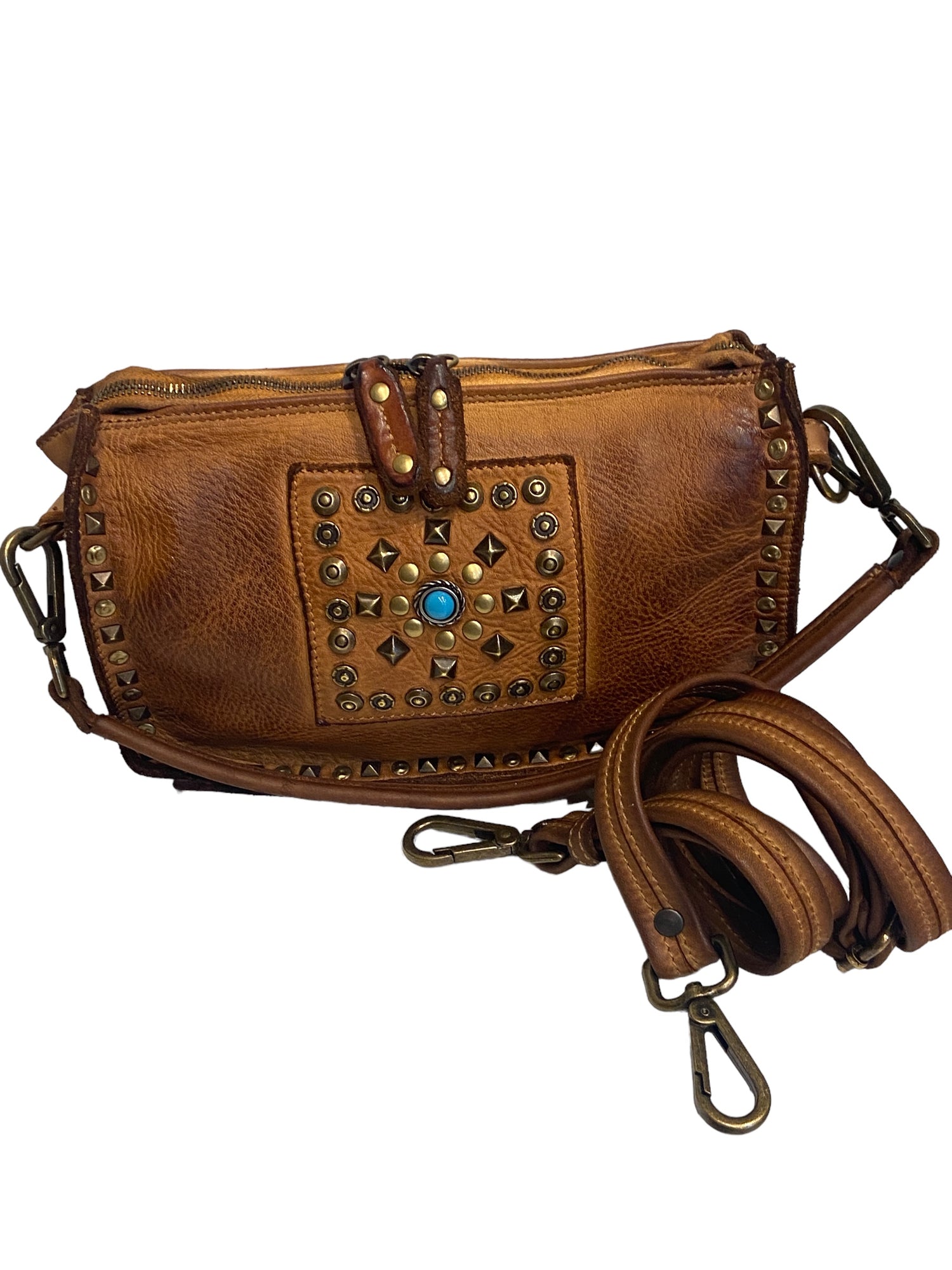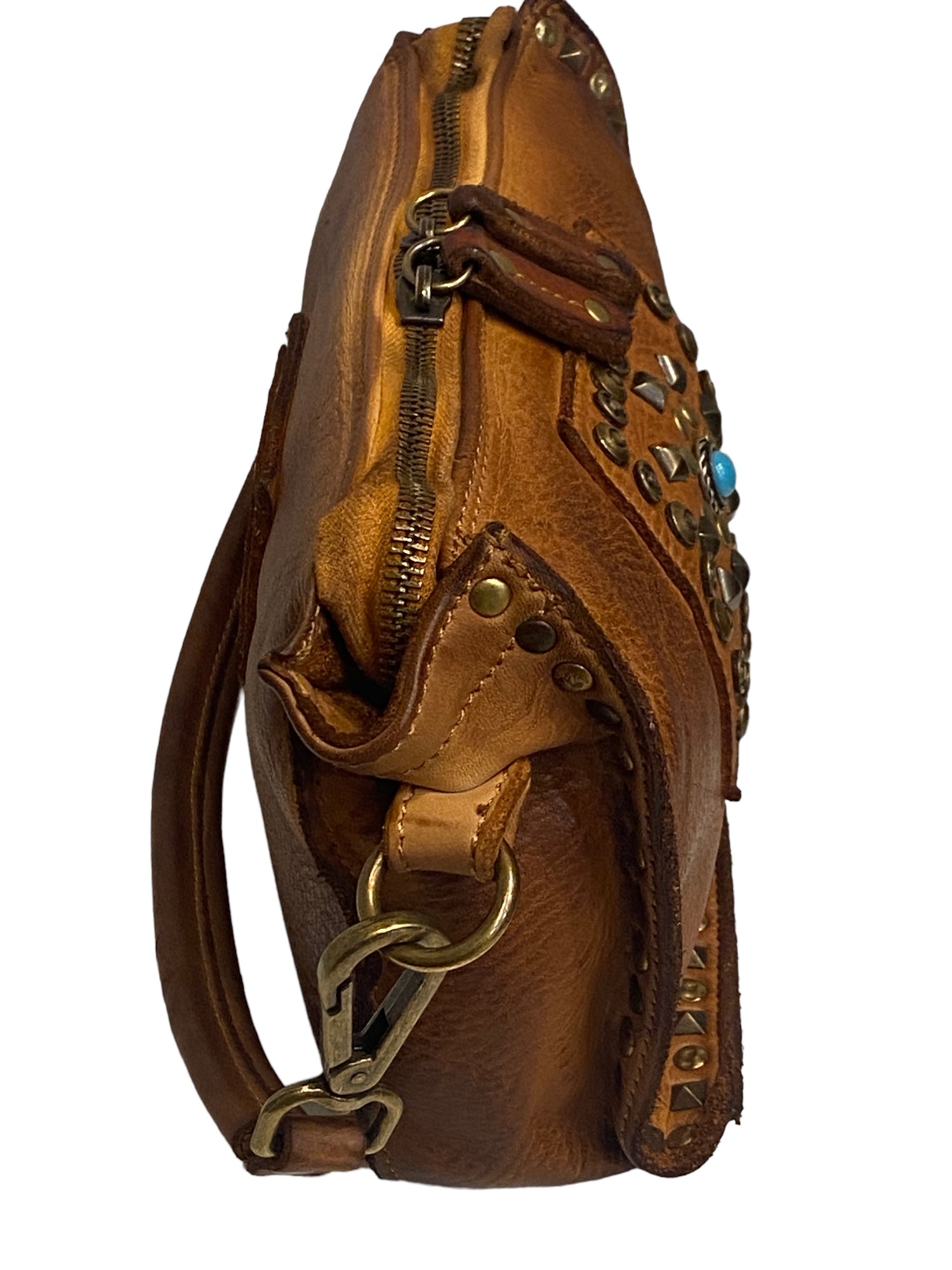 Borsa in cuoio realizzata con la particolare tecnica della "tintura in capo" ( immersione della borsa gia' cucita e realizzata, in botti contenenti colore ed emolienti). Questo procedimento minuziosamente artigianale rende il prodotto una creazione unica ed esclusiva nella sua imperfezione. Lo zaino risulta piu' morbido e dall'aspetto lavato e vintage. Questo modello e' impreziosito dall'inserimento di una serie di borchie di varie forme, dimensioni e colori.