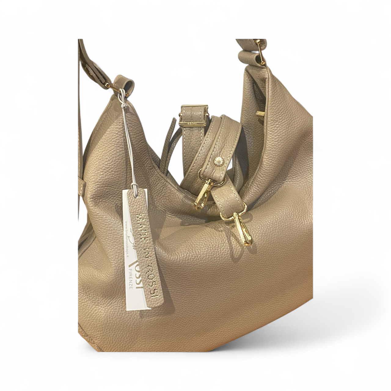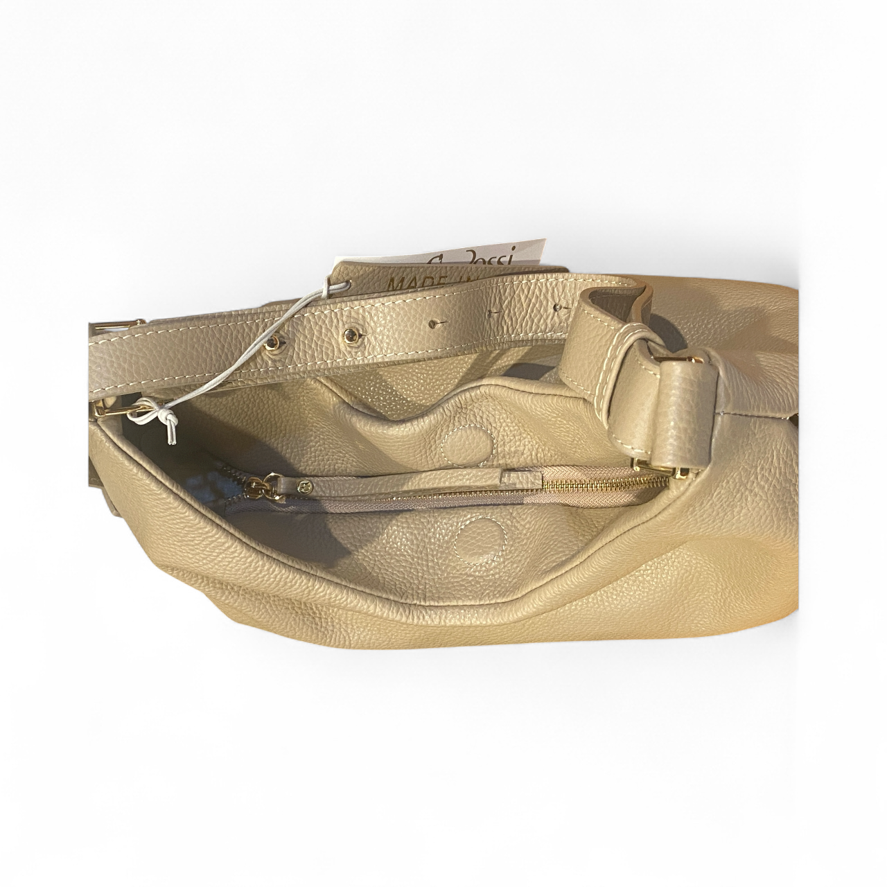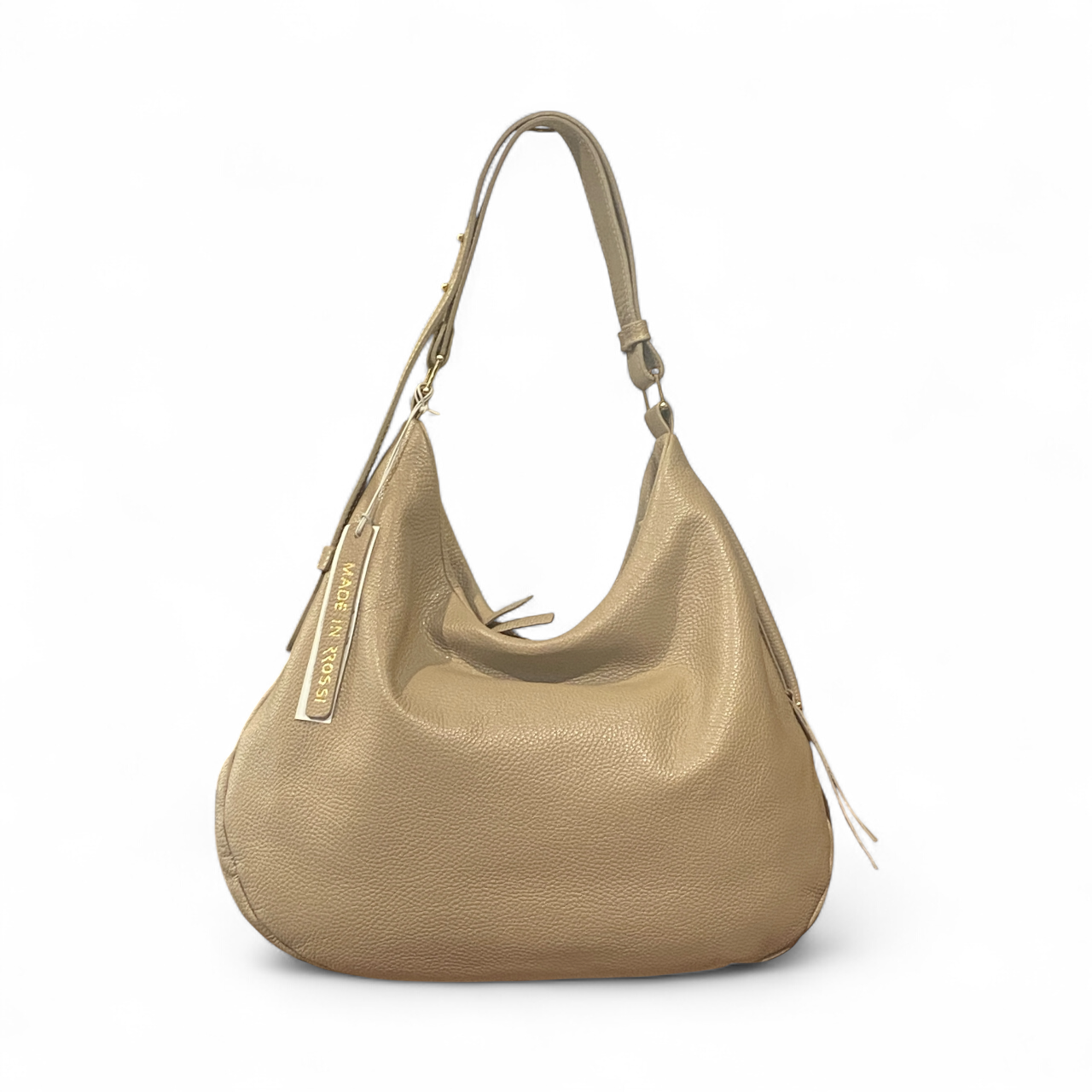 Sacca a spalla realizzata in morbida pelle di vitello a grana stampa dollaro. Tasca laterale esterna chiusa con zip ed ulteriori spazi interni organizzati. La borsa ha la tracolla per spalla modulabile in ampiezza e tracolla lunga(in pelle) regolabile e removibile. Accessori metallici con finitura color oro. Manifattura rigorosamente Made In Italy.