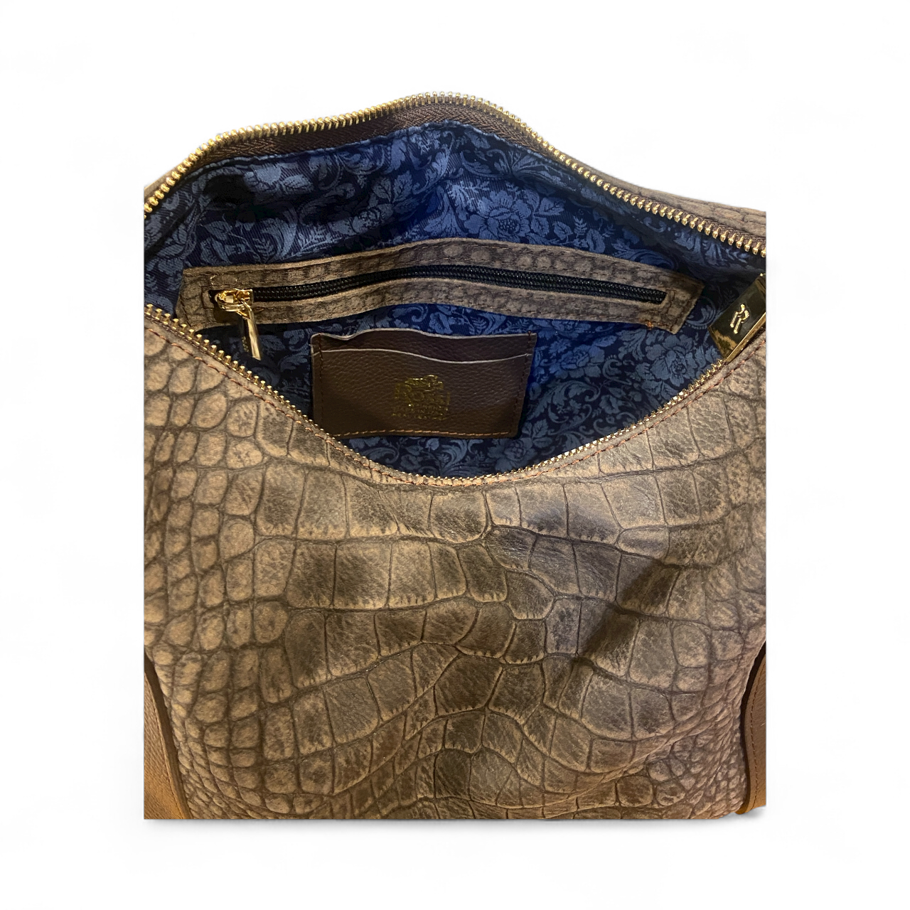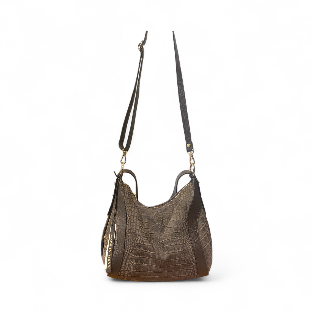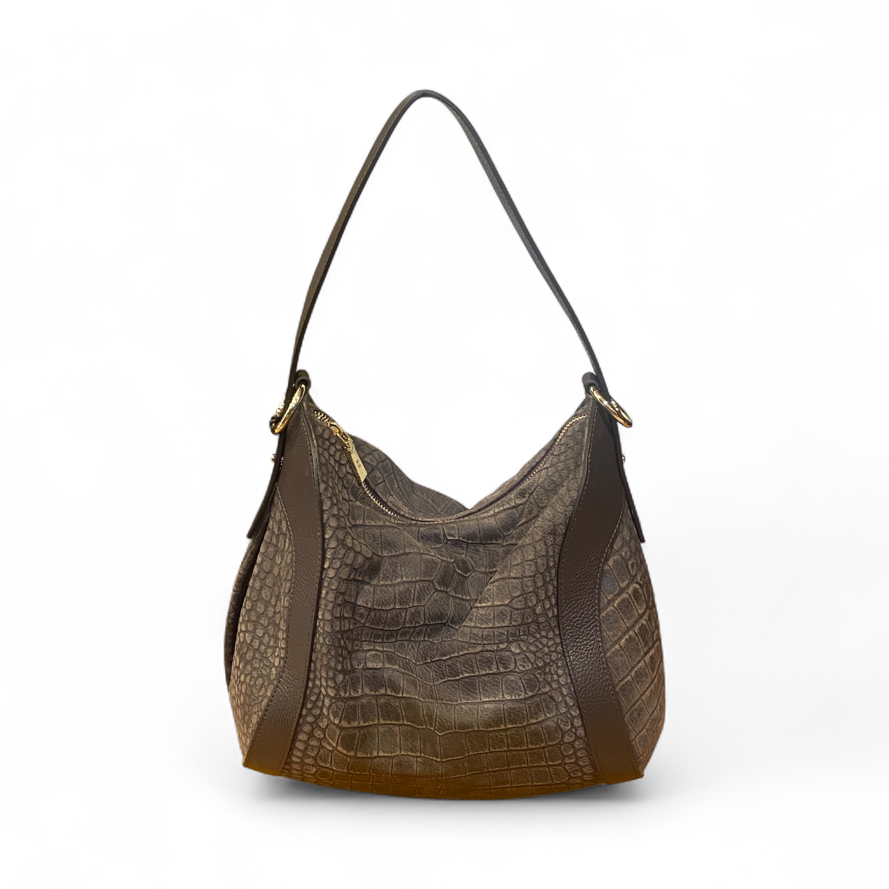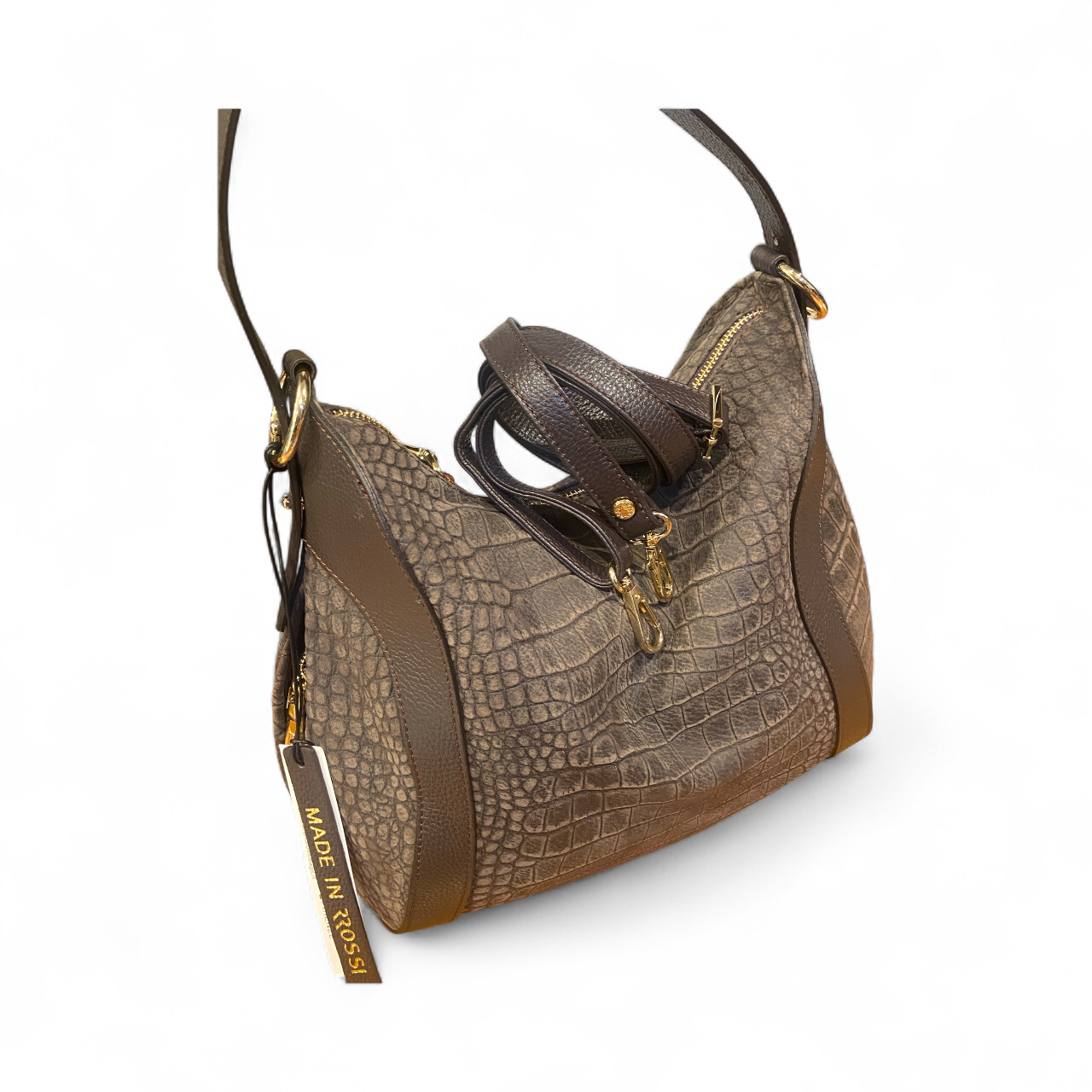 Borsa di medie dimensioni realizzata in morbida pelle di vitello stampa cocco. Rifiniture tono su tono in cuoio testa di moro. Due tasche esterne chiuse con zip su entrambi i fianchi. La borsa e' dotata anche di tracolla lunga regolabile e removibile.