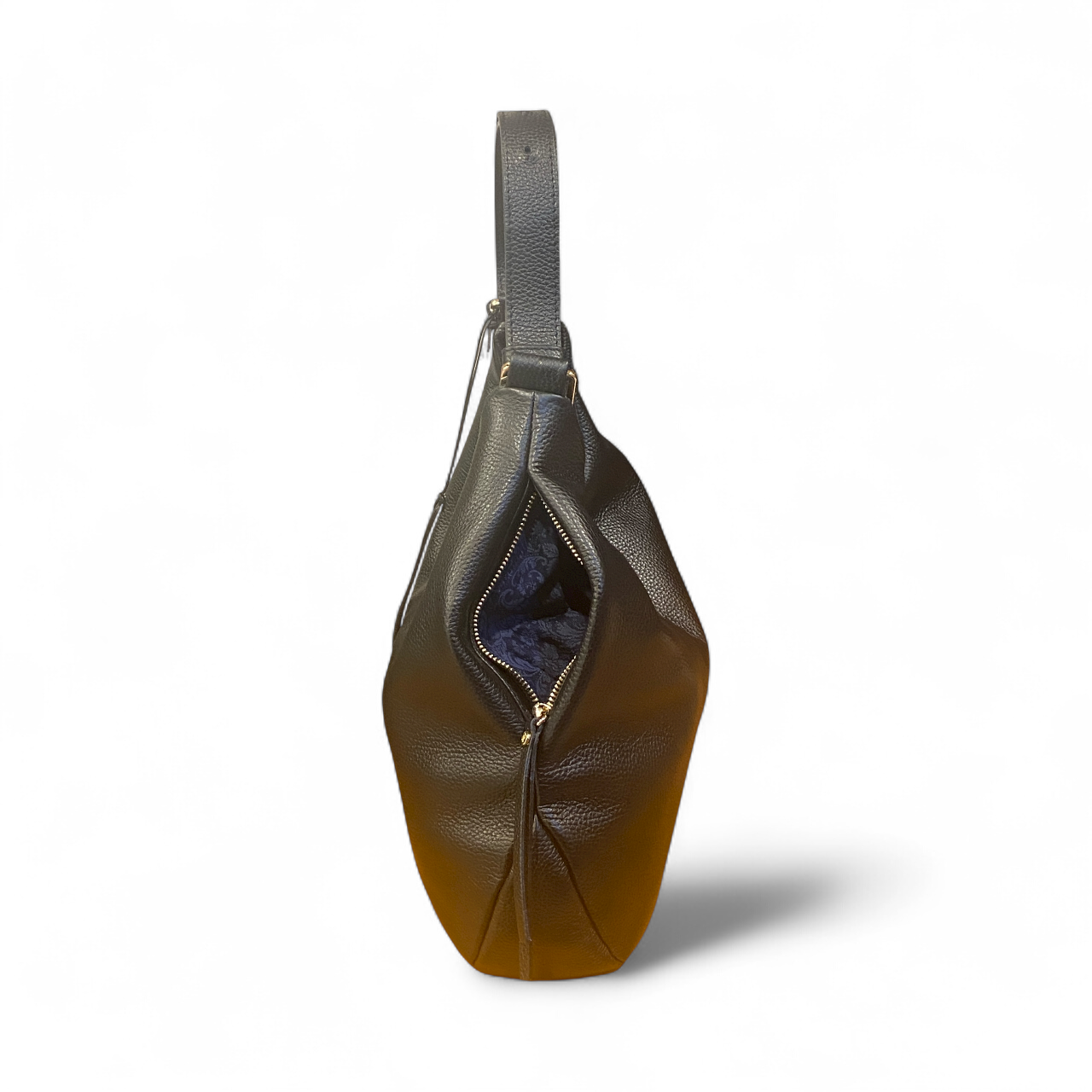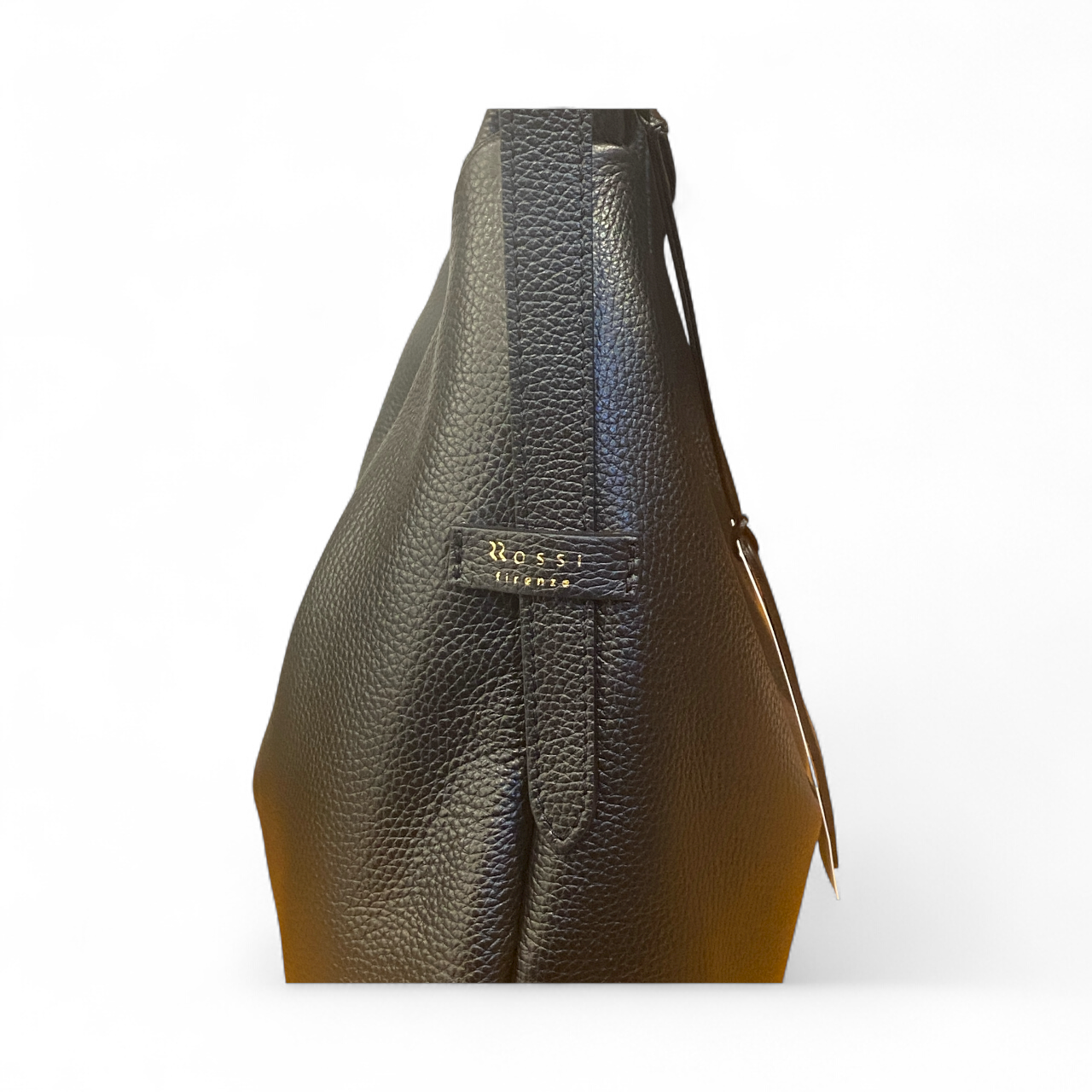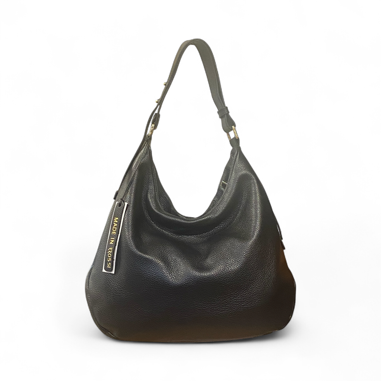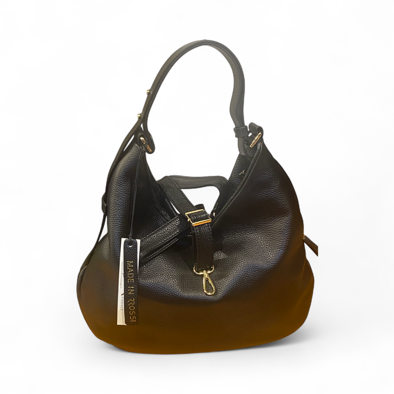 Sacca a spalla realizzata in morbida pelle di vitello a grana stampa dollaro. Tasca laterale esterna chiusa con zip ed ulteriori spazi interni organizzati. La borsa ha la tracolla per spalla modulabile in ampiezza e tracolla lunga(in pelle) regolabile e removibile. Accessori metallici con finitura color oro. Manifattura rigorosamente Made In Italy.