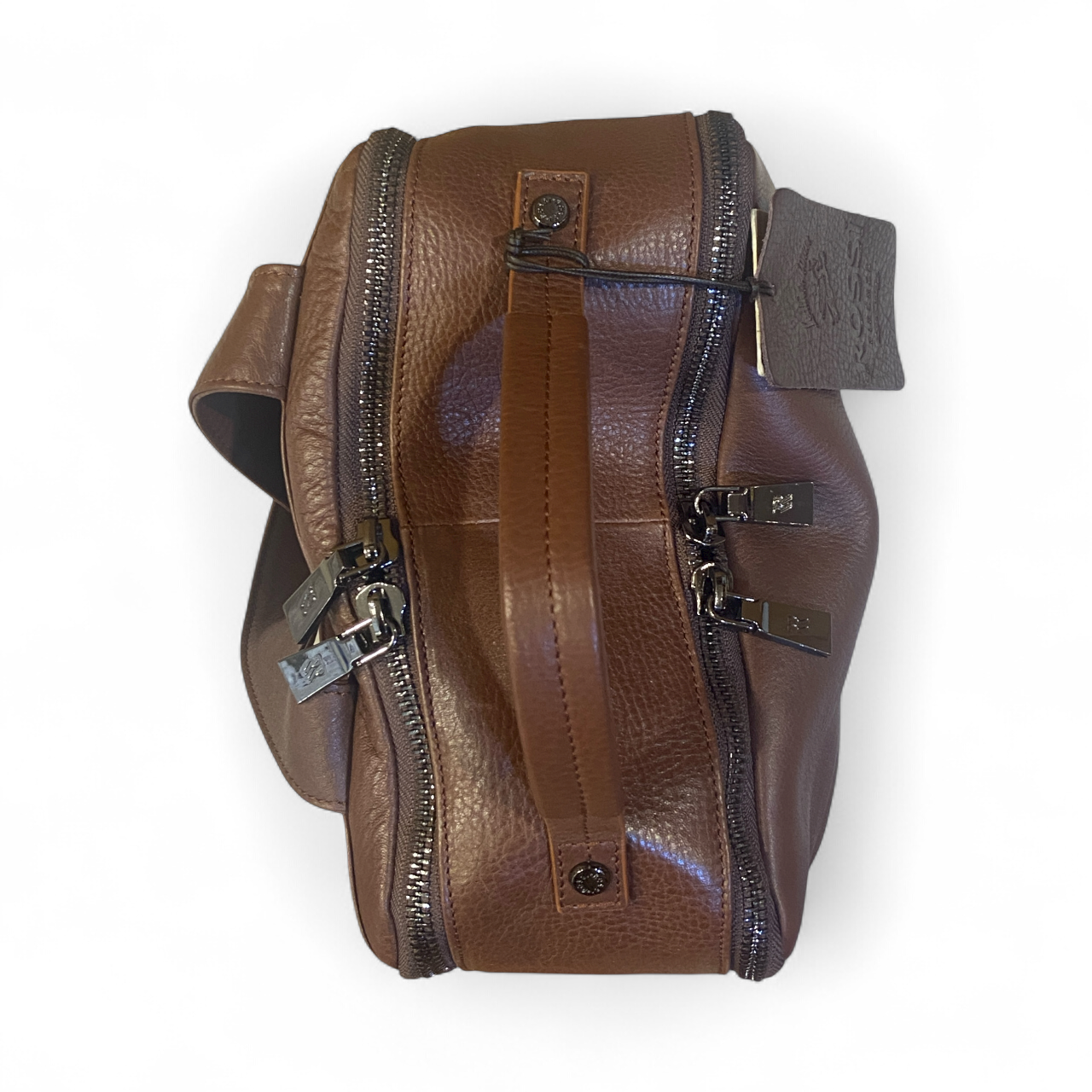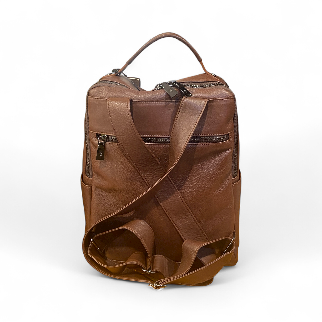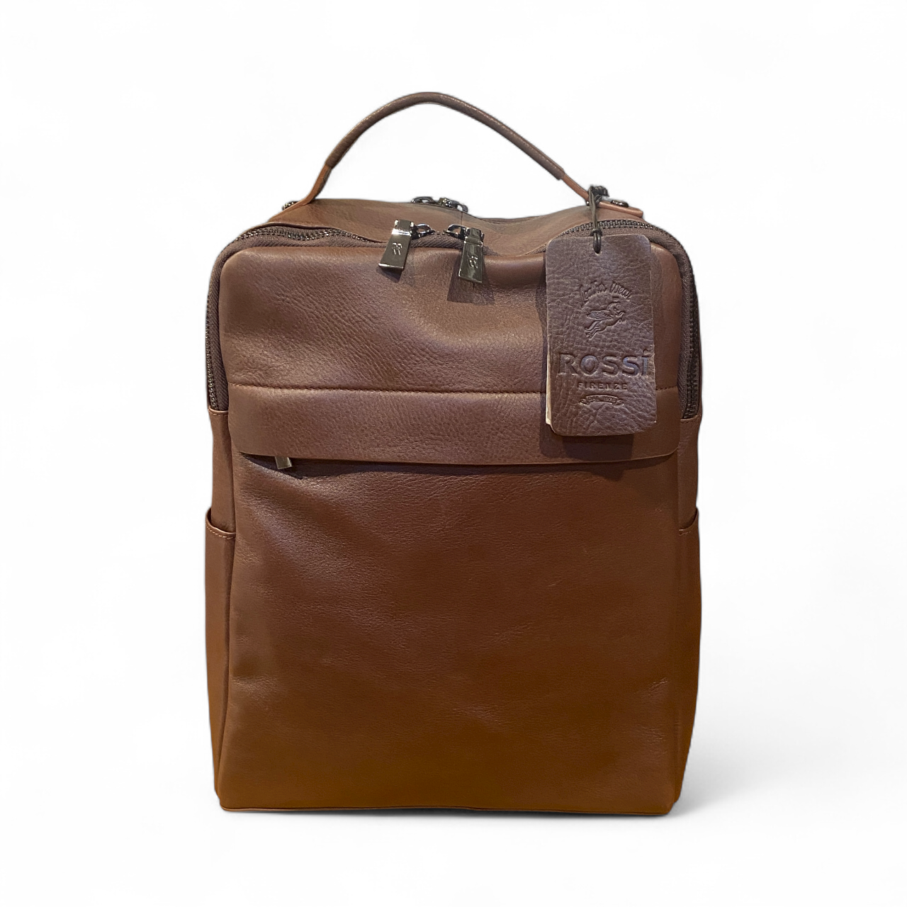 Zaino unisex di grandi dimensioni realizzato in morbido cuoio. L'articolo ha due scomparti principali e due tasche esterne, chiuse con zip, una frontale, l'altra sul retro. Gli spallacci sono larghi 3,7 cm e consentono di indossare lo zaino col massimo confort. All'interno vari spazi organizzati tra cui un'apposita tasca porta PC. Ai fianchi tasche per ombrello e borraccia.