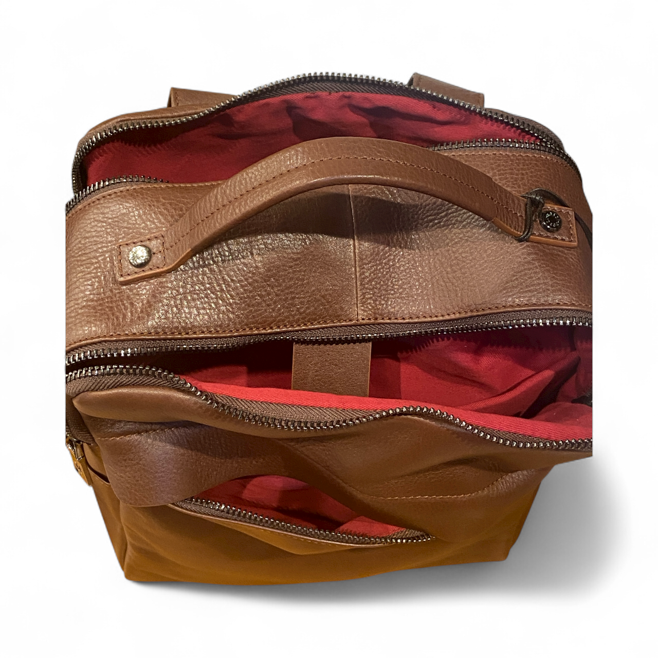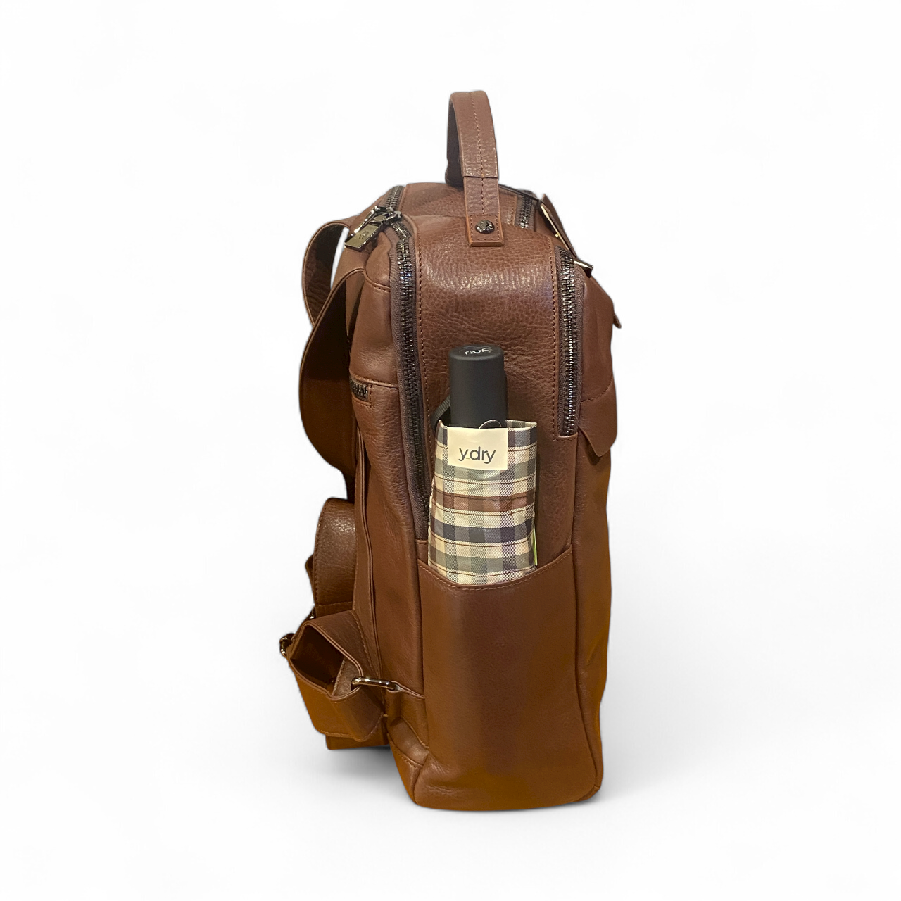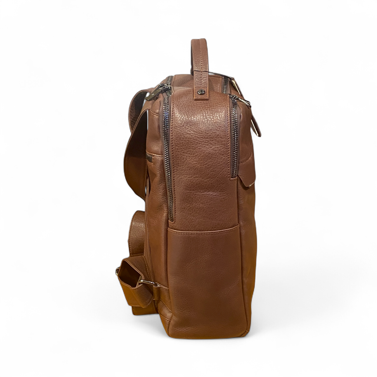 Zaino unisex di grandi dimensioni realizzato in morbido cuoio. L'articolo ha due scomparti principali e due tasche esterne, chiuse con zip, una frontale, l'altra sul retro. Gli spallacci sono larghi 3,7 cm e consentono di indossare lo zaino col massimo confort. All'interno vari spazi organizzati tra cui un'apposita tasca porta PC. Ai fianchi tasche per ombrello e borraccia.