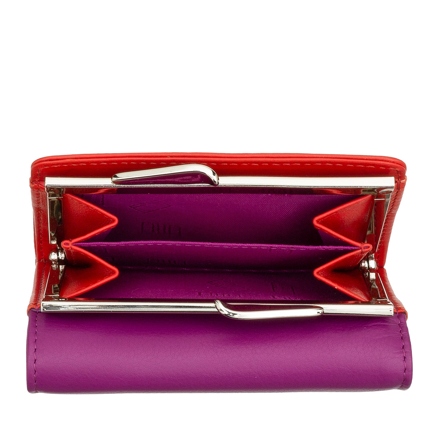 Portafoglio piccolo e compatto realizzato in morbida pelle di vitello. Questo modello si caratterizza per un rapido e facile accesso alle monete grazie al posizionamento esterno del classico soffietto con chiusura in metallo. All'interno 10 slots per carte di credito e scomparto per banconote.