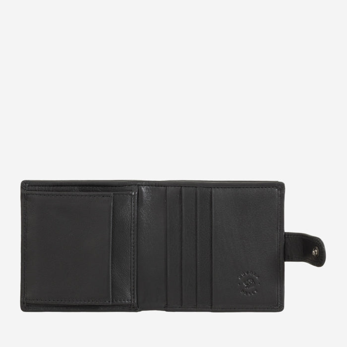 Portafoglio quadrato di piccole dimensioni realizzato in morbida pelle di vitello. 4 spazi per carte di credito, tasca per banconote e portamonete a pozzetto. Chiusura con laccio a clip.