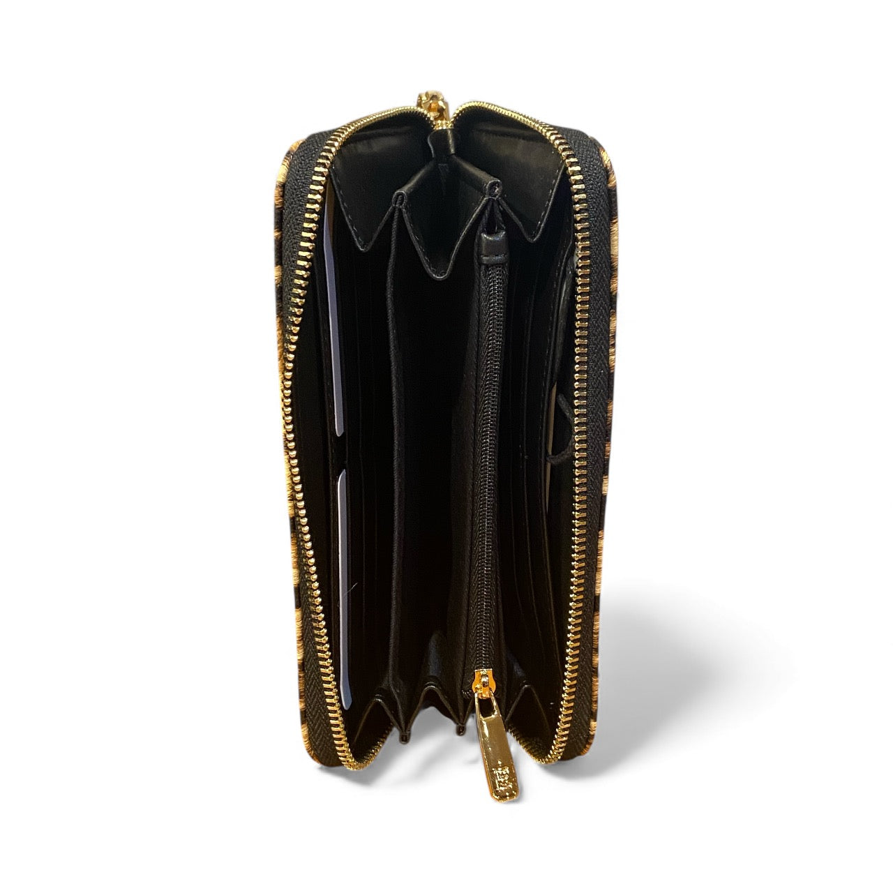 Portafoglio zip around con 12 slots per carte di credito e cinque scomparti per banconote e documenti. Porta monete centrale con chiusura a zip.