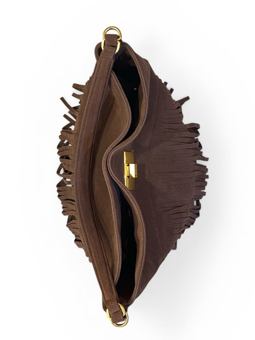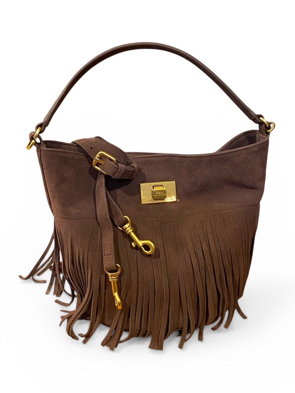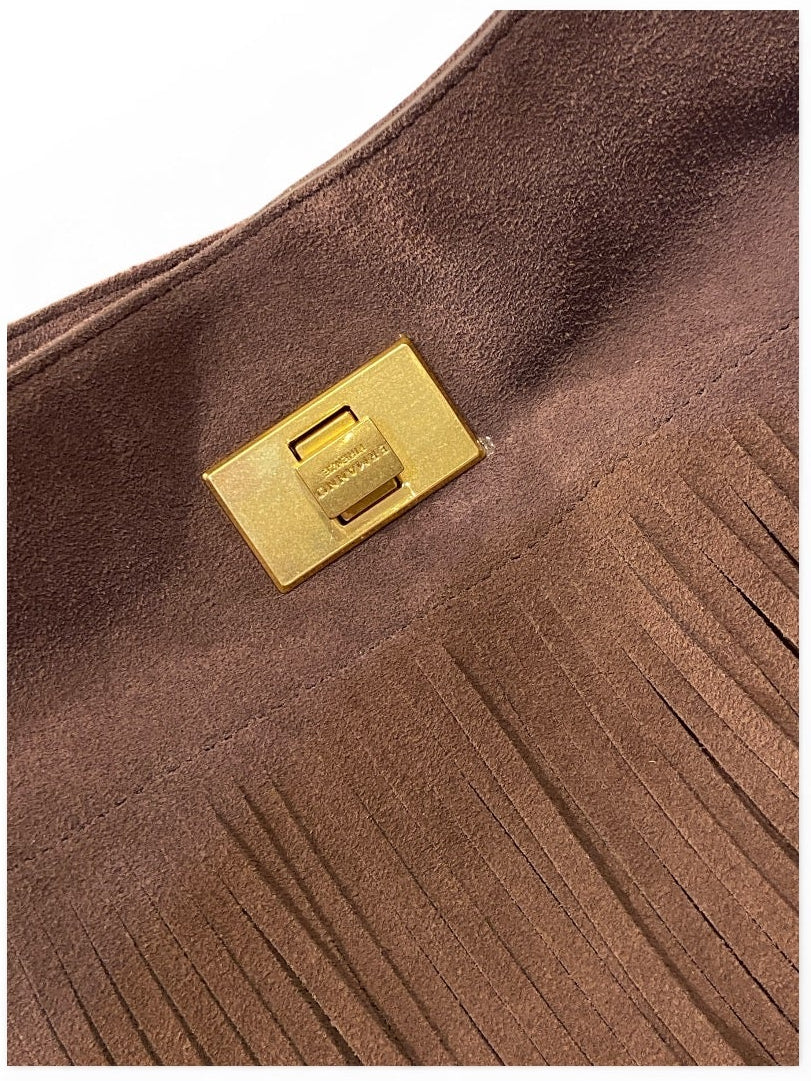Borsa modello secchiello realizzata in morbida pelle di camoscio. Chiusura metallica. Doppia tracolla. Monogramma e dettagli in metallo dorati opachi.