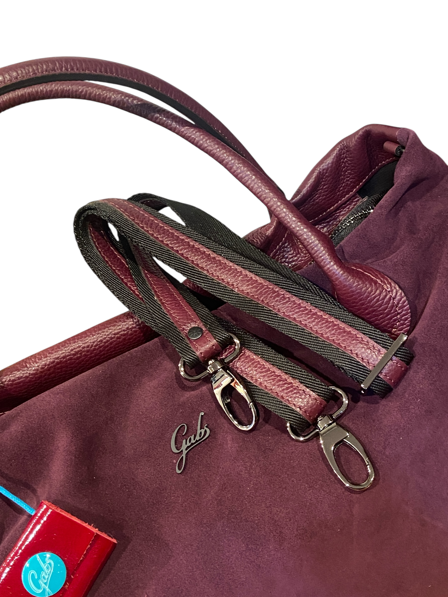 Shopping realizzata in doppio materiale, pelle scamosciata sul davanti e pelle di vitello sul retro. I colori sono tono su tono. La borsa e' trasformabile e riducibile nelle dimensioni grazie alle clips sulla base. L'articolo e' fornito anche di tracolla lunga a nastro, regolabile e removibile.