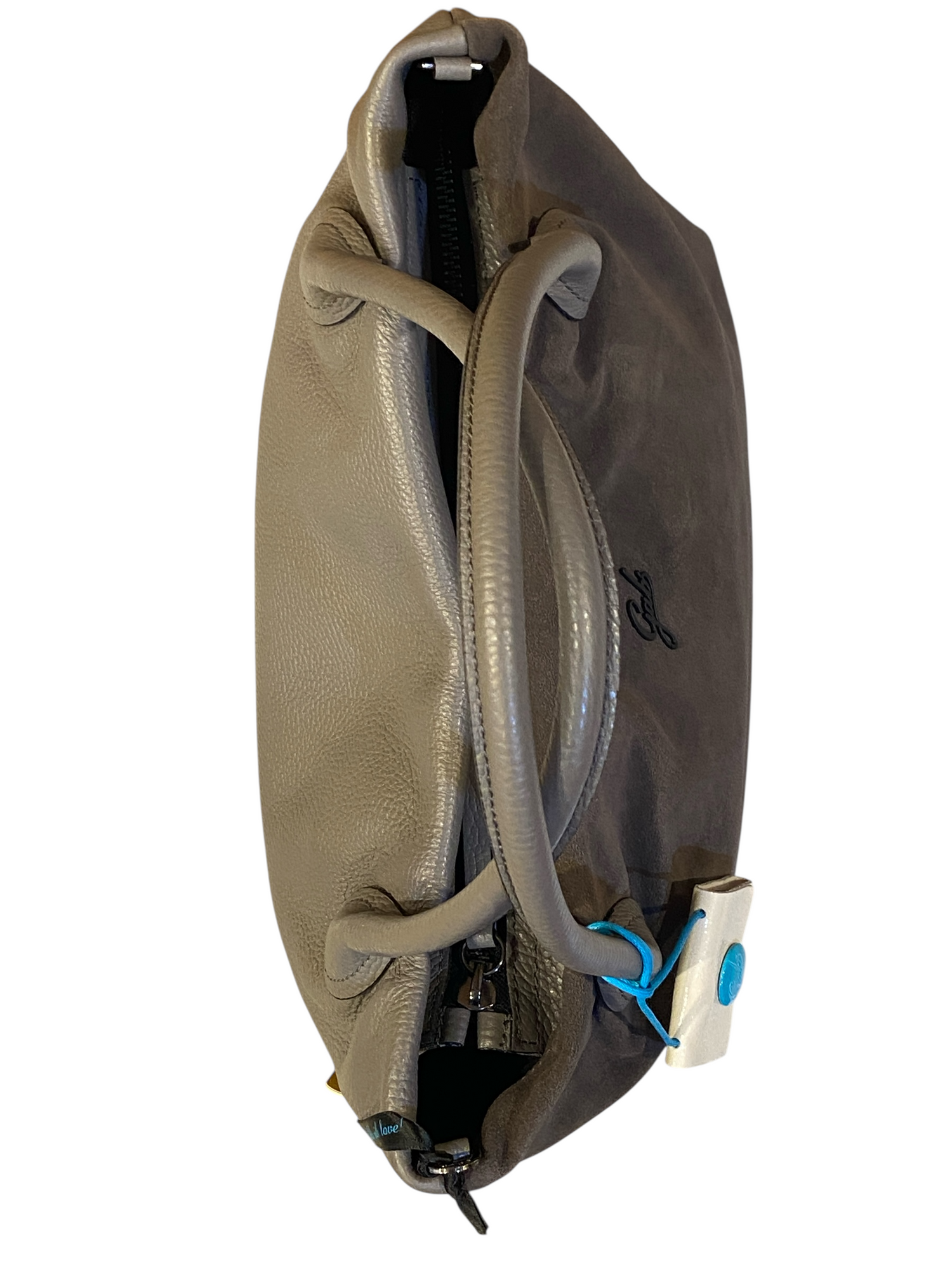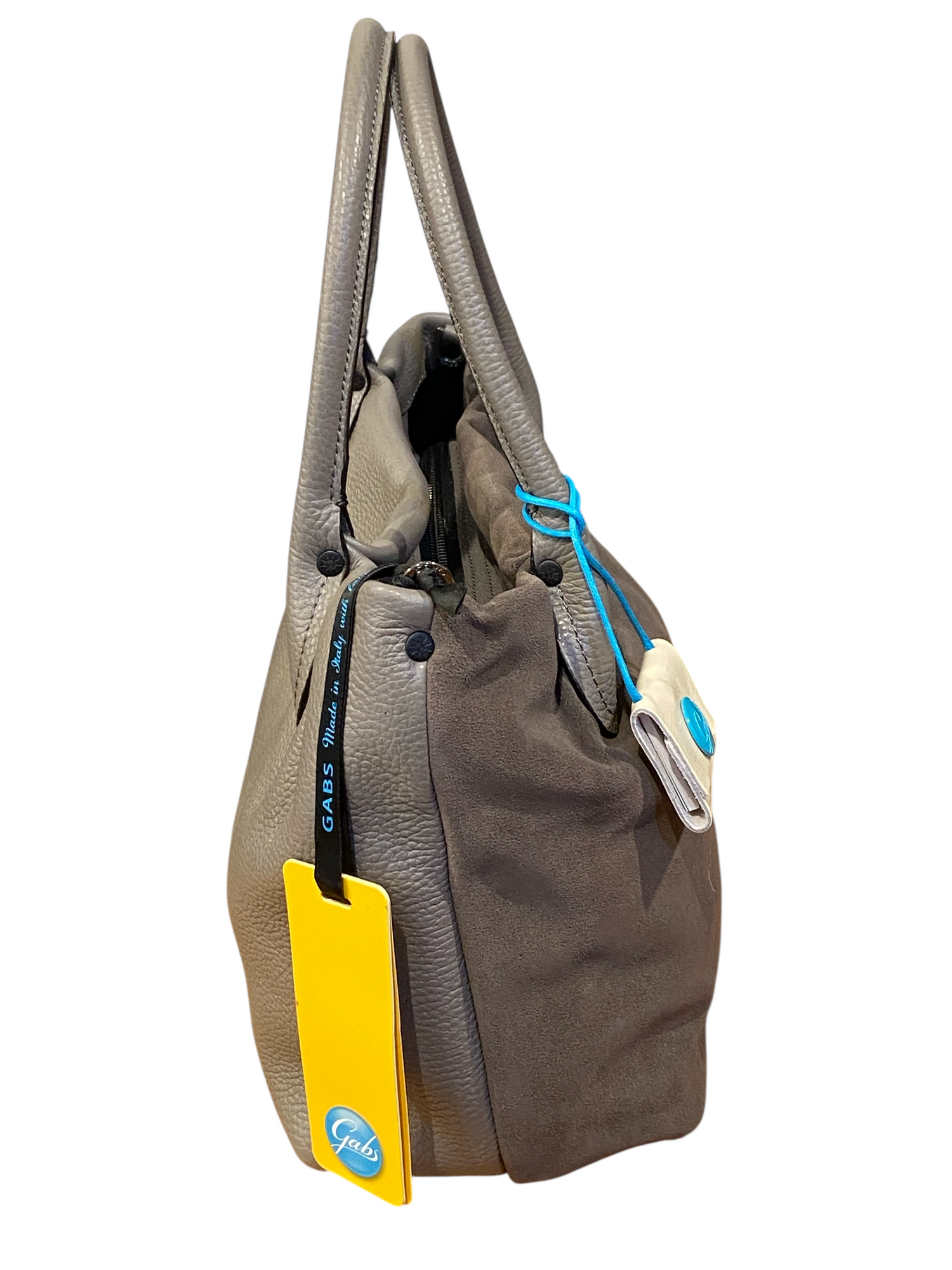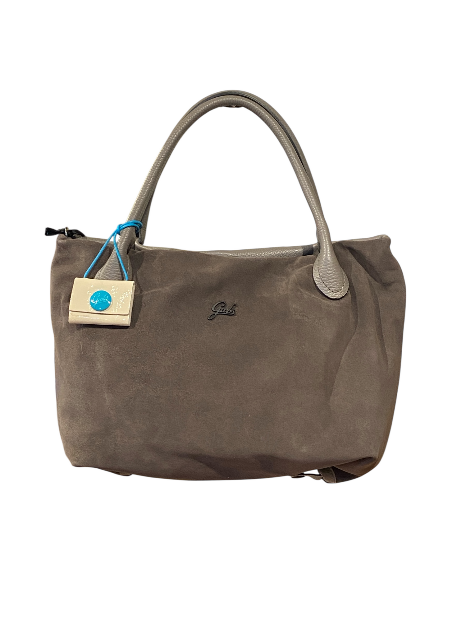 Shopping realizzata in doppio materiale, pelle scamosciata sul davanti e pelle di vitello sul retro. I colori sono tono su tono. La borsa e' trasformabile e riducibile nelle dimensioni grazie alle clips sulla base. L'articolo e' fornito anche di tracolla lunga a nastro, regolabile e removibile.