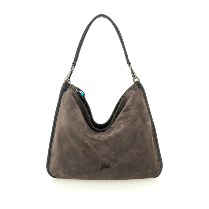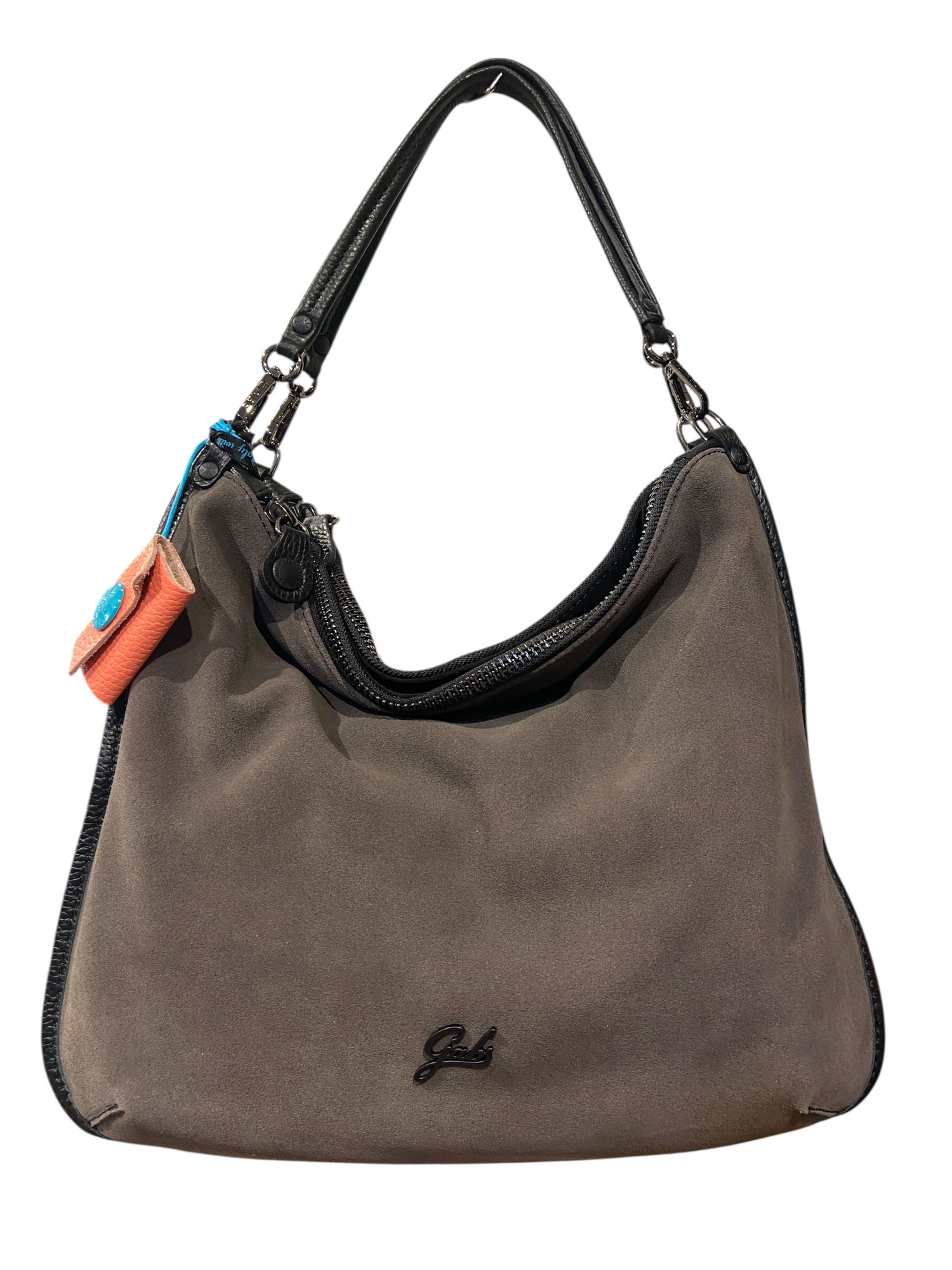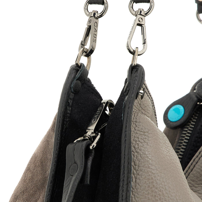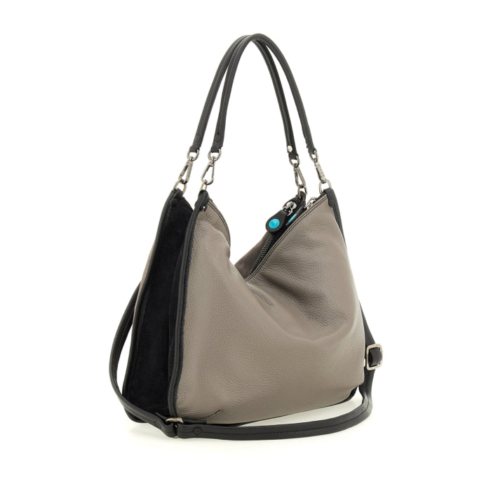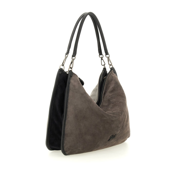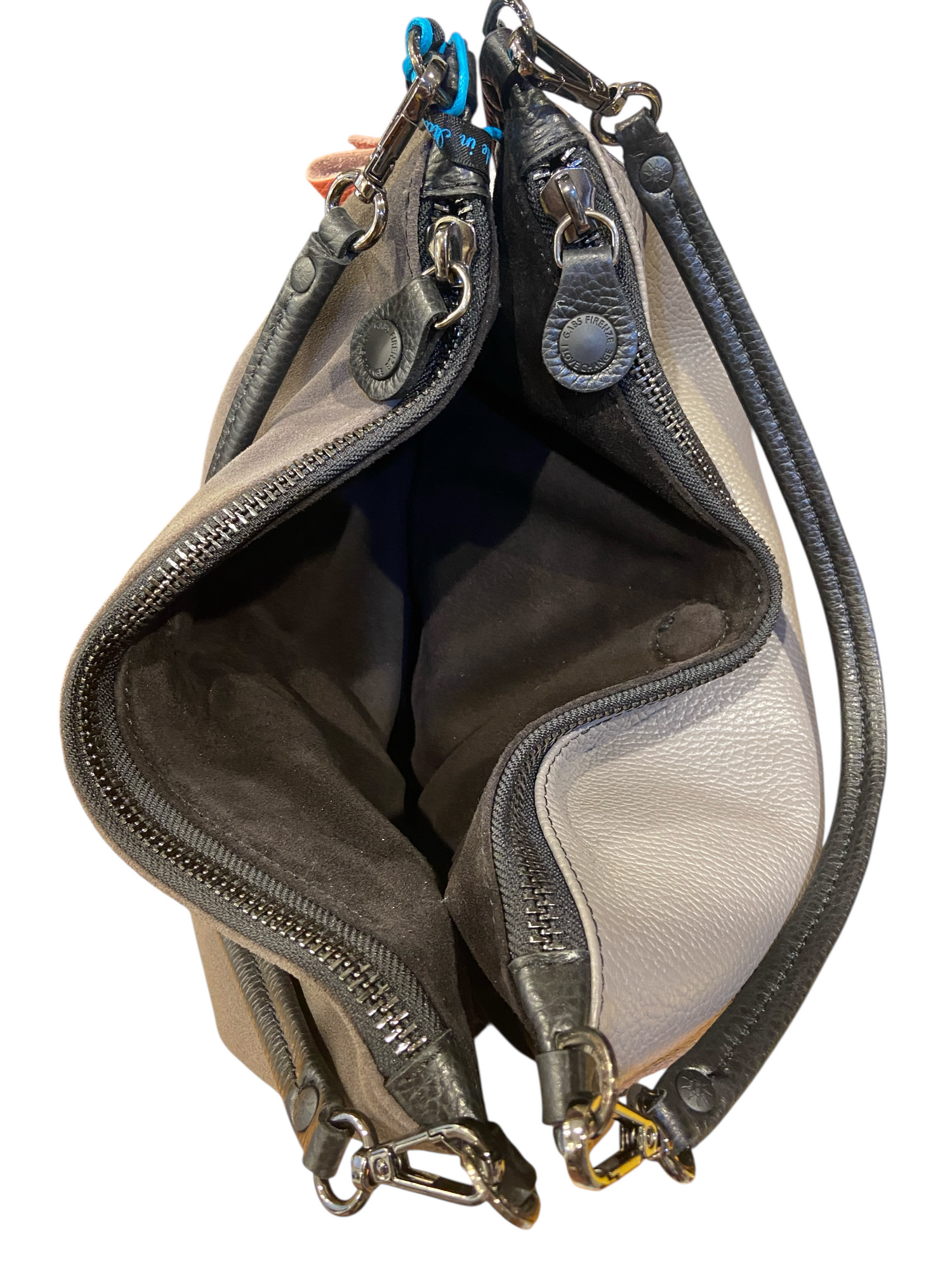 Borsa shopping BICOLOR realizzata con doppio materiale, pelle di vitello scamosciata e pelle di vitello martellata. Il colore proposto e' un elegante abbinamento di Taupe e Testa Moro. L'articolo ha due scomparti separati chiusi con zip e tracolla lunga regolabile e removibile.