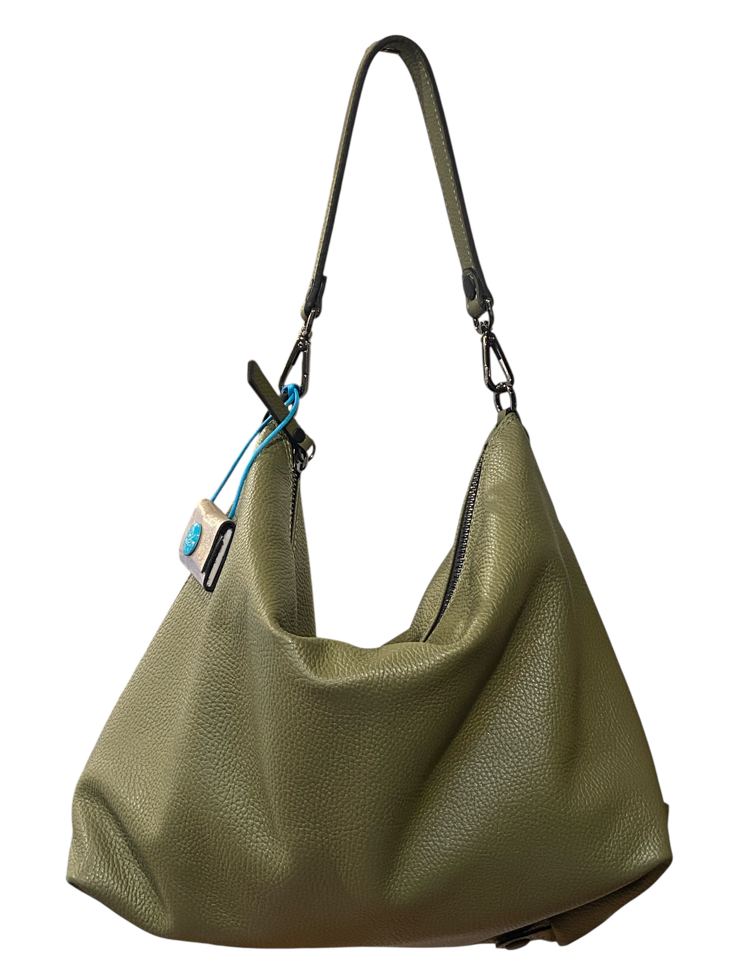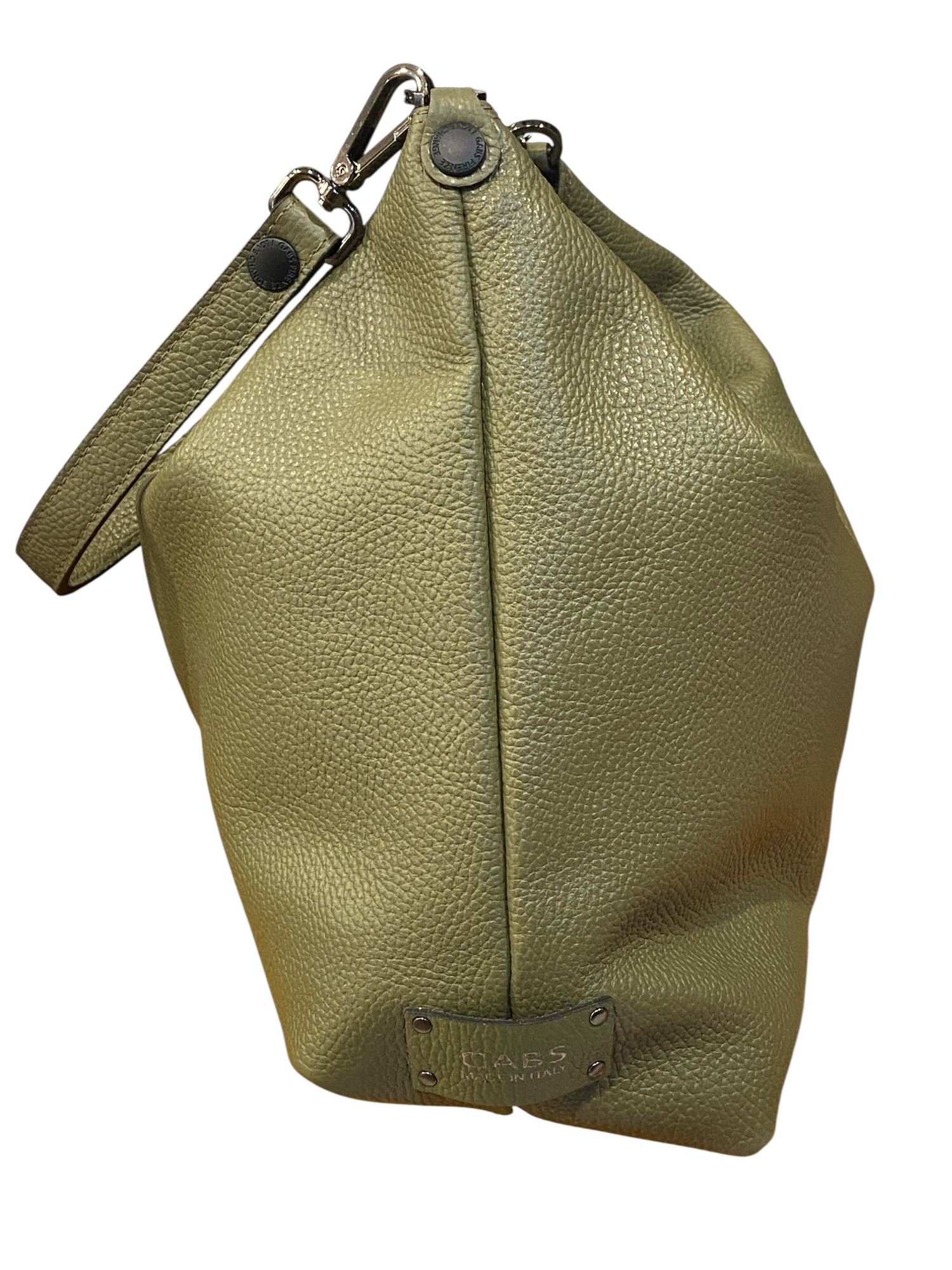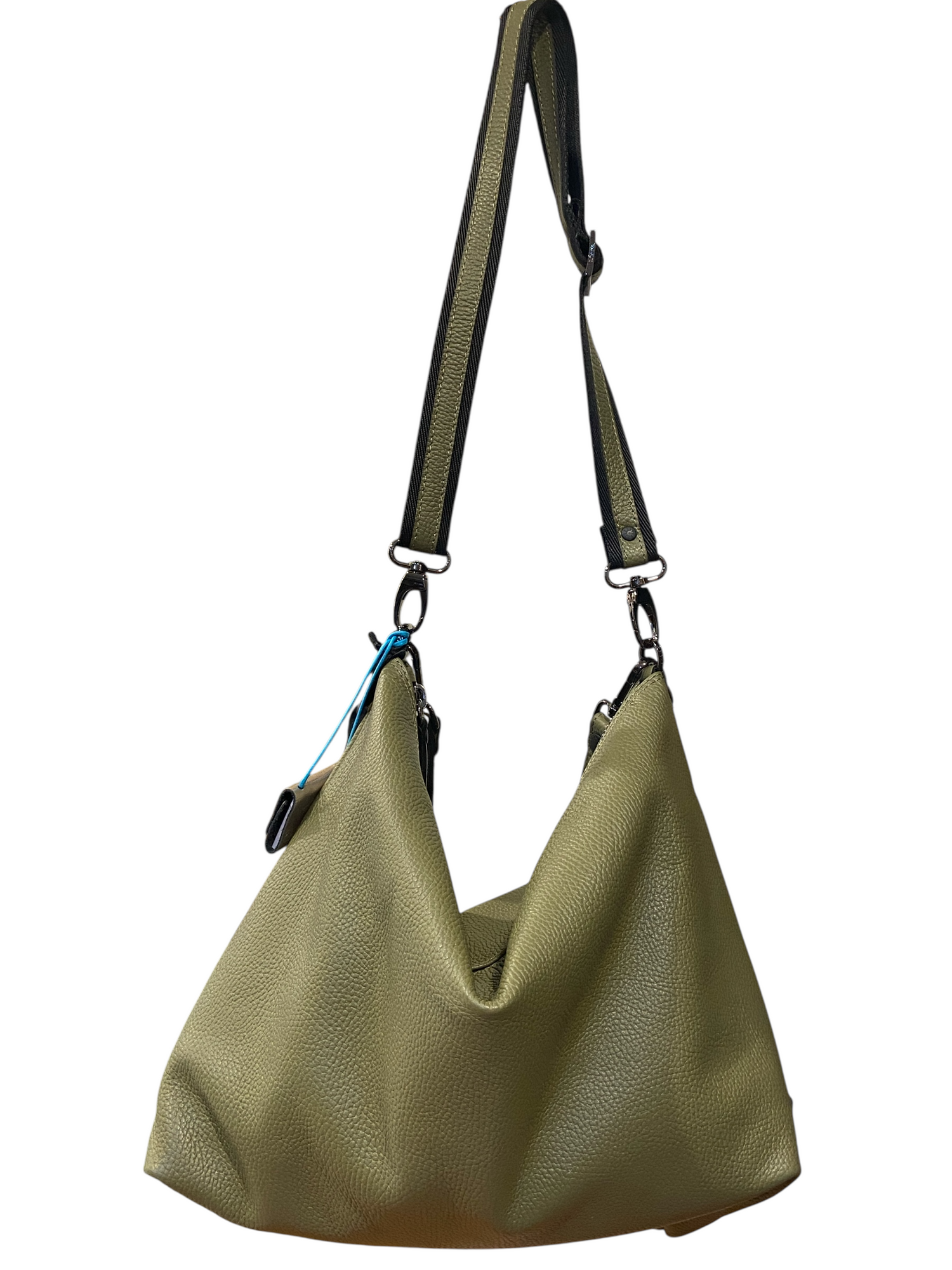 Borsa a sacca realizzata in morbidissima pelle di vitello. Trasformabile e riducibile nelle dimensioni grazie alle clips sulla base. L'articolo e' anche dotato di tracolla lunga a nastro (regolabile).