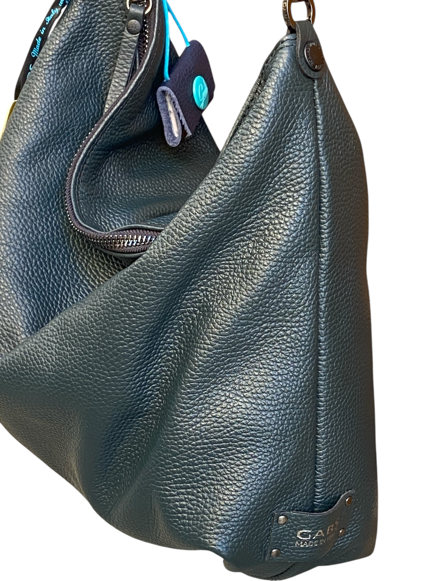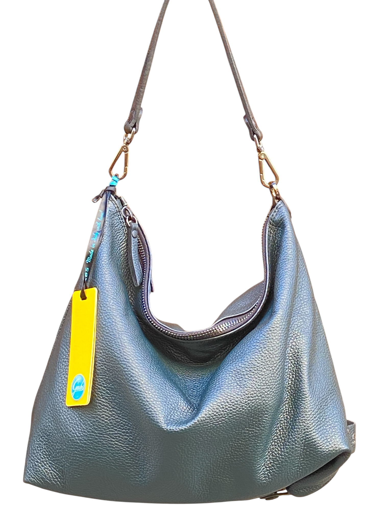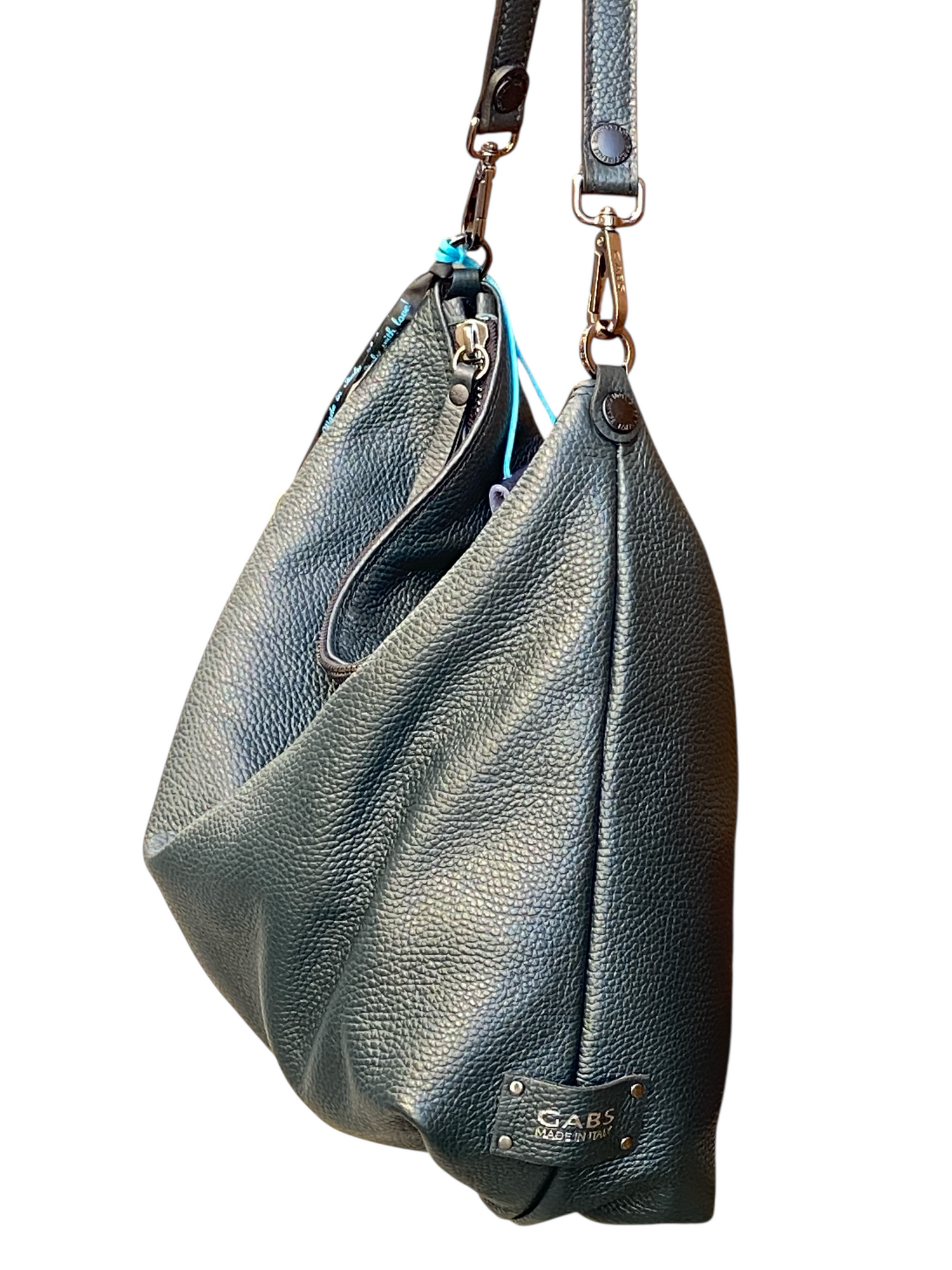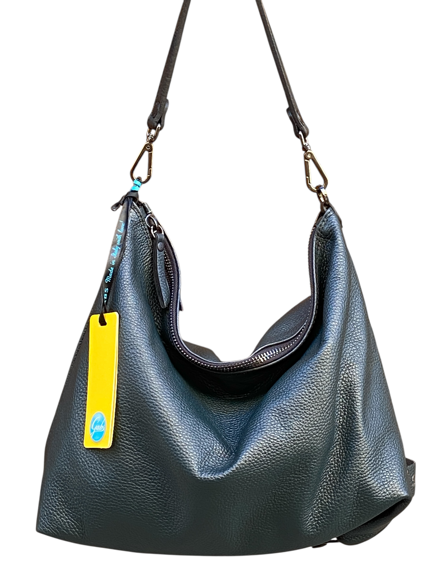 Borsa a sacca realizzata in morbidissima pelle di vitello. Trasformabile e riducibile nelle dimensioni grazie alle clips sulla base. L'articolo e' anche dotato di tracolla lunga a nastro (regolabile).