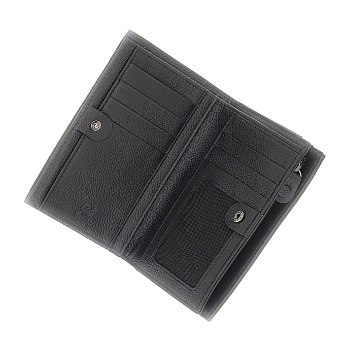 Portafoglio in pelle di vitello con chiusura a bottone e tasca esterna porta monete chiusa con zip. All'interno 6 slots porta carte di credito, ribaltina con porta documenti a vista e doppio scomparto per banconote.