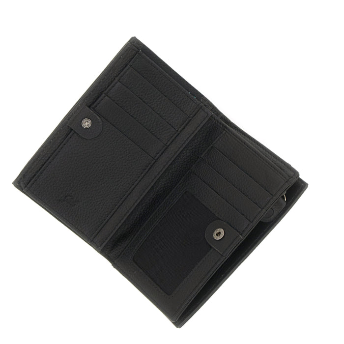 Portafoglio in pelle di vitello con chiusura a bottone e tasca esterna porta monete chiusa con zip. All'interno 6 slots porta carte di credito, ribaltina con porta documenti a vista e doppio scomparto per banconote.