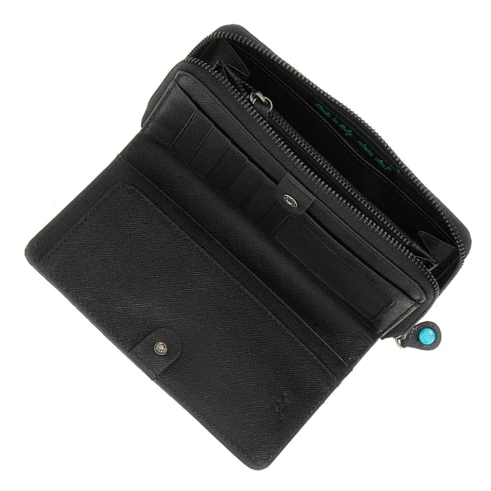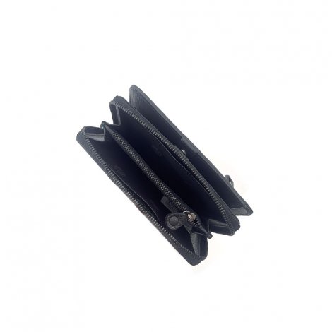 Portafoglio realizzato in morbida pelle di vitello con tasca portamonete chiusa con zip sul retro,6 slots per carte di credito, 3 tasche per documenti e doppio scomparto zippato per banconote.