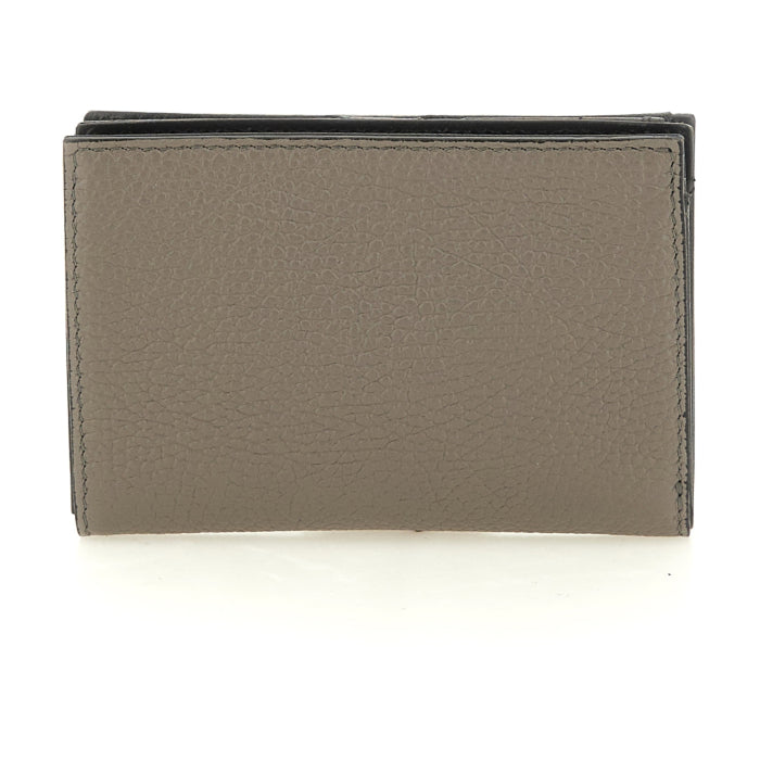 Portafoglio in pelle di vitello con chiusura a bottone e tasca esterna porta monete chiusa con zip. All'interno 6 slots porta carte di credito, ribaltina con porta documenti a vista e doppio scomparto per banconote.