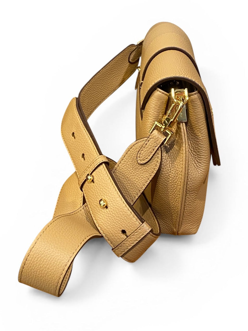 Borsa di piccole dimensioni realizzata in morbida pelle di vitello. Doppio scomparto interno con tasca/divisorio chiusa con cerniera lampo. Tasca esterna sul retro chiusa con zip. Accessori di finitura in color oro personalizzati. Logo centrale in rilievo