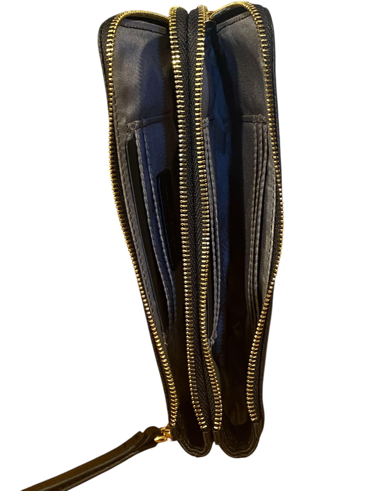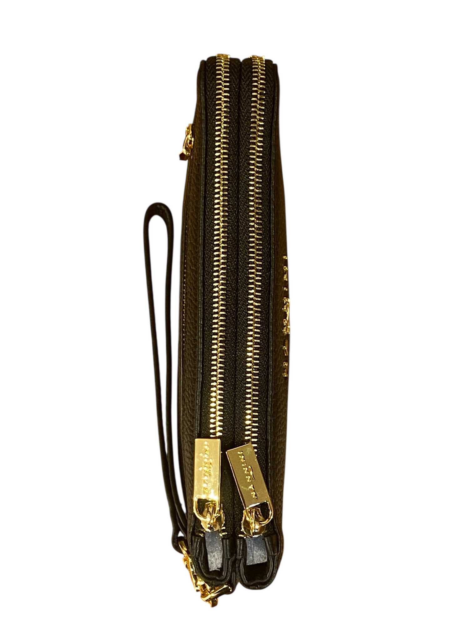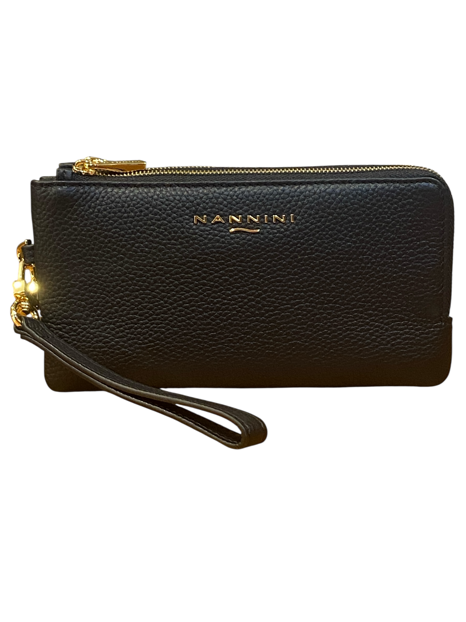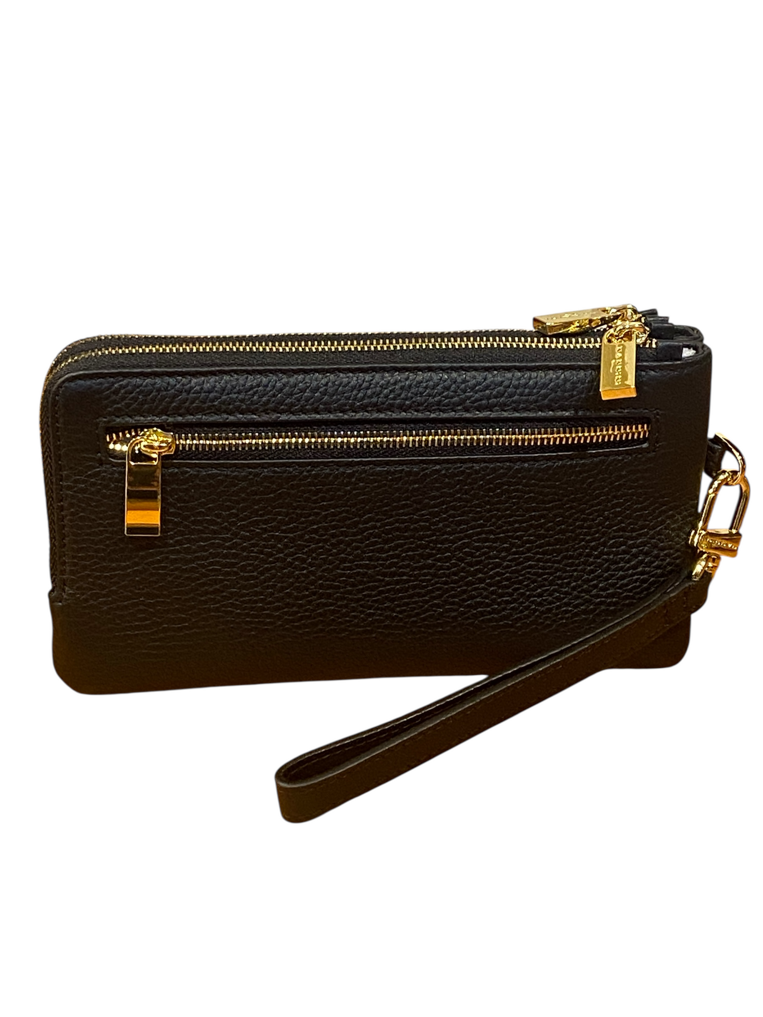 Portafoglio ad astuccio realizzato in morbida pelle di vitello. Il modello e' particolarmente pratico in quanto ha due comodi scomparti organizzati ( all'interno 12 slots per carte di credito) e il portamonete esterno sul retro chiuso con zip.
