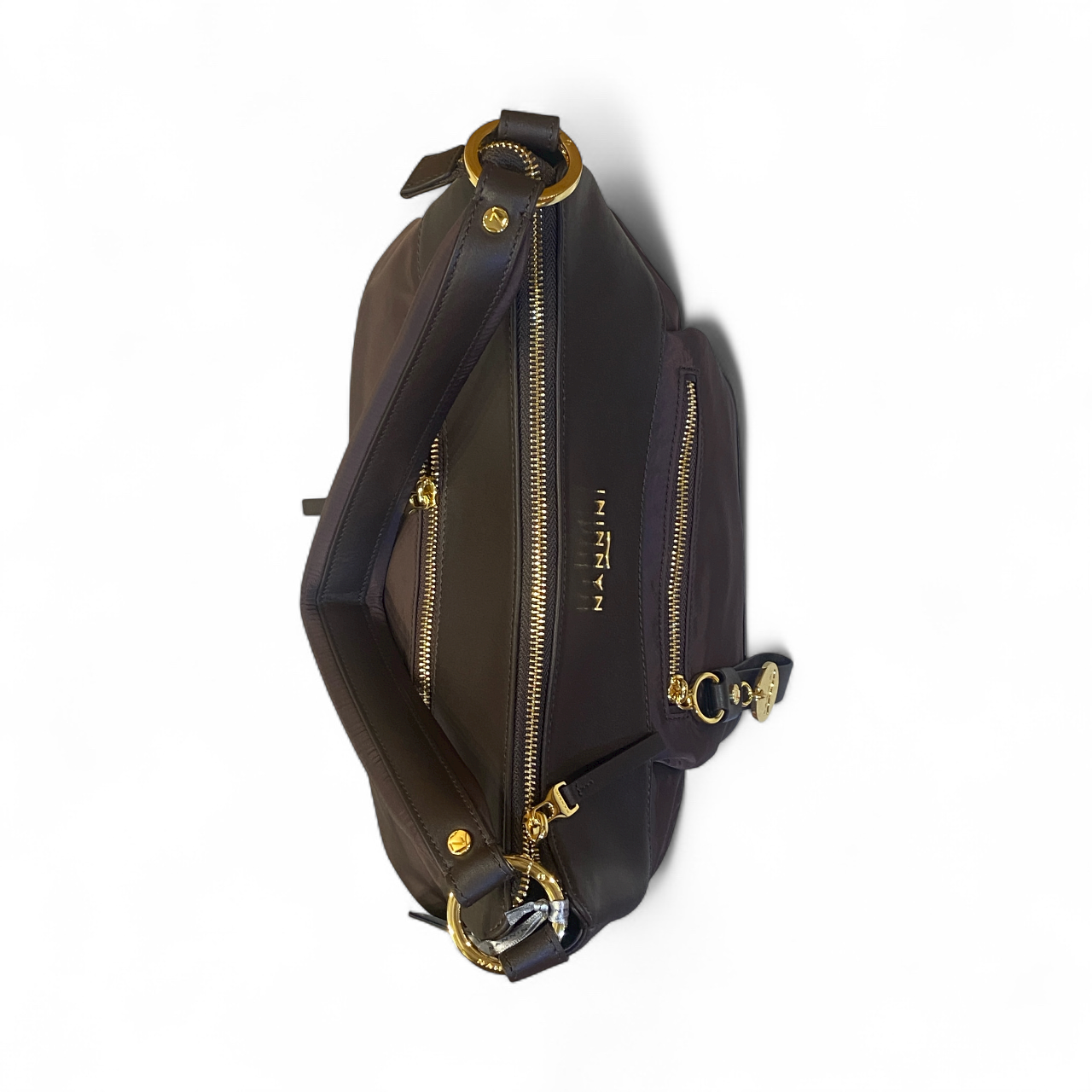 Borsa realizzata in resistente e leggero tessuto tecnico con rifiniture in pelle tono su tono. Accessori metallici personalizzati in color oro. Logo centrale in rilievo. Questo modello a mezza luna ha due pratiche tasche esterne chiuse con zip (una piccola frontale e l'altra, piu' ampia, sul retro). All'interno spazi organizzati e tasca chiusa con zip. La borsa e' dotata anche di tracolla a nastro regolabile e removibile.