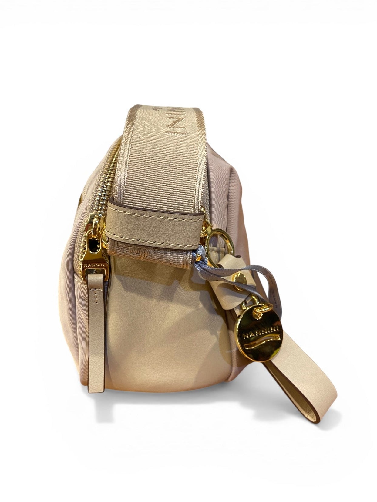 Borsa di piccole dimensioni realizzata in resistente e leggero tessuto tecnico con rifiniture in pelle tono su tono. Tracolla a nastro logata regolabile a misura. Accessori metallici personalizzati in color oro. Logo centrale in rilievo. Due scomparti chiusi con zip e tasca esterna sul retro.