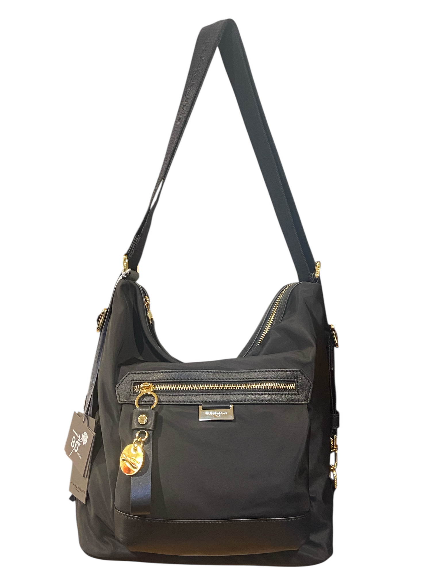Borsa realizzata in resistente e leggero tessuto tecnico con rifiniture in pelle tono su tono. Accessori metallici personalizzati in color oro. Logo centrale in rilievo. Pratica ed ampia tasca frontale esterna chiusa con zip. All'interno vari spazi organizzati. Trasformabile in zaino con un semplice gesto.