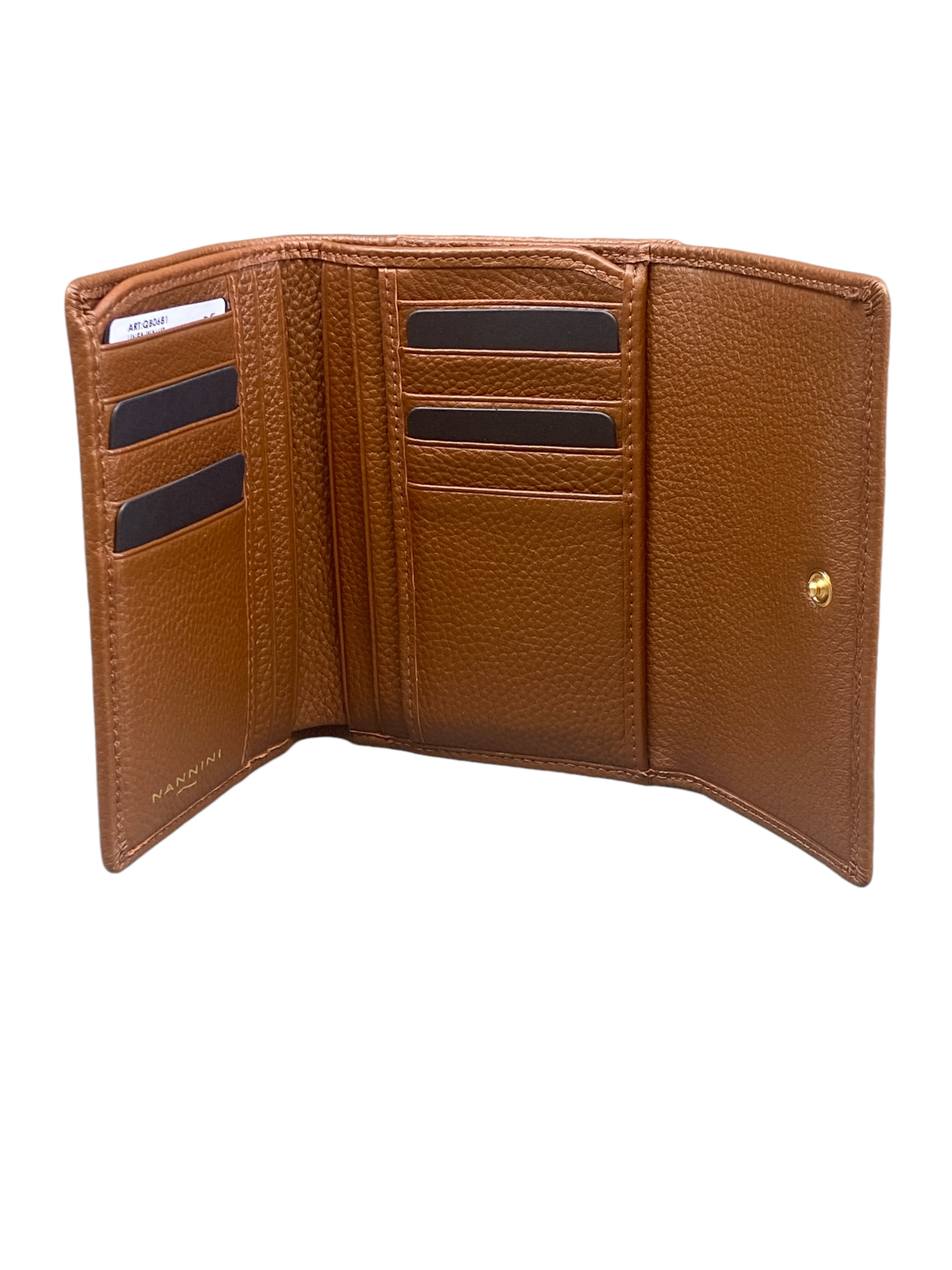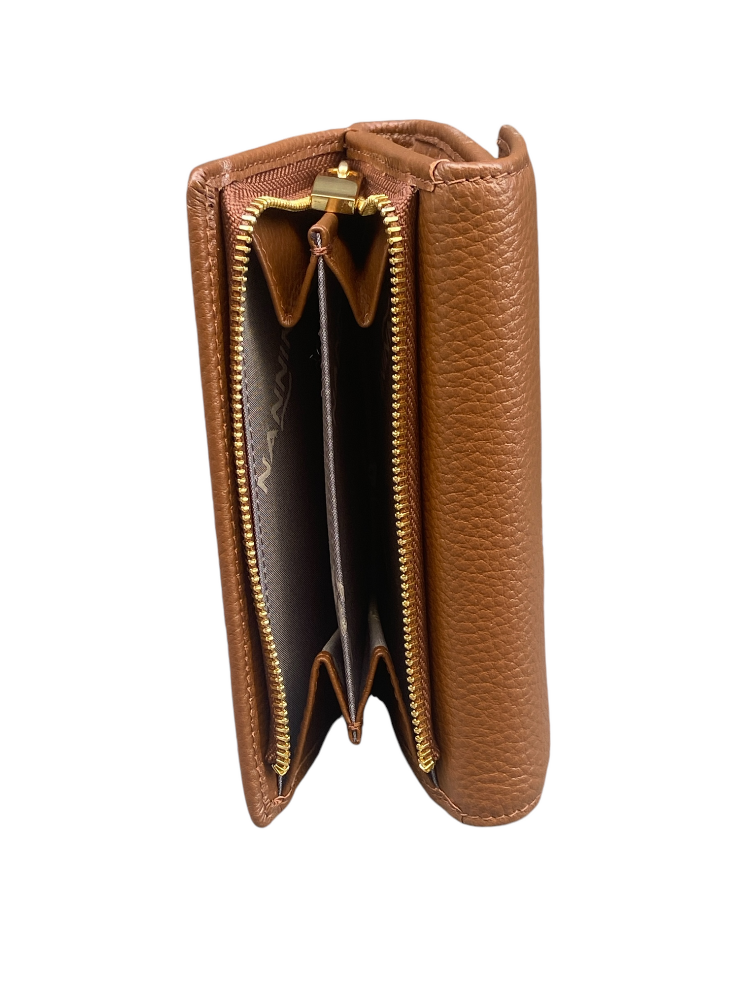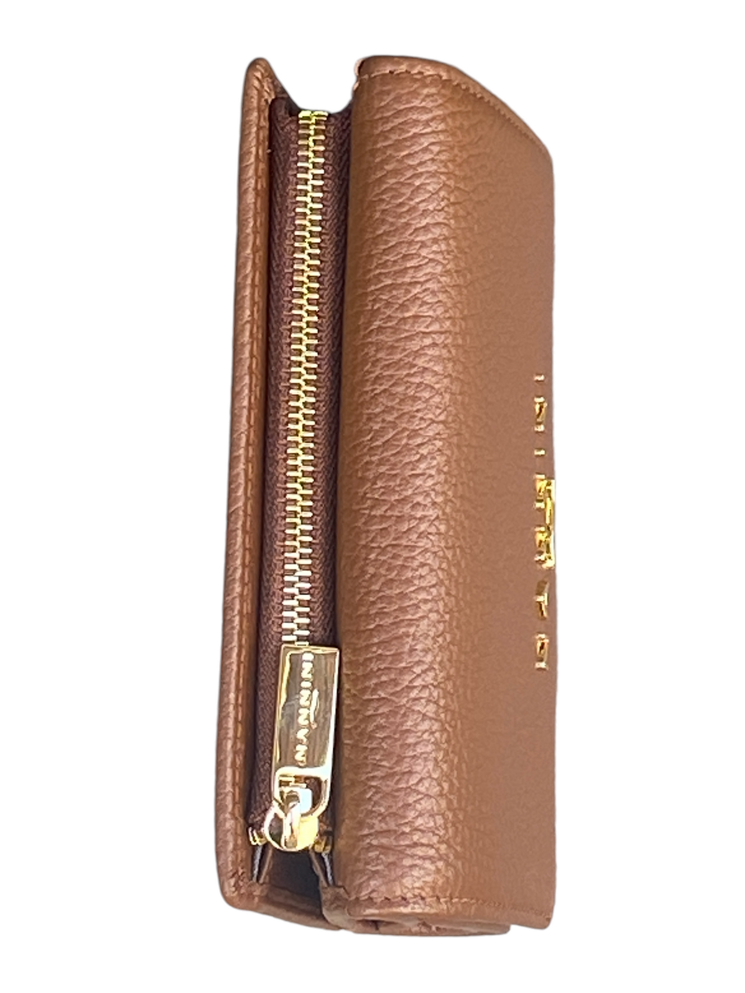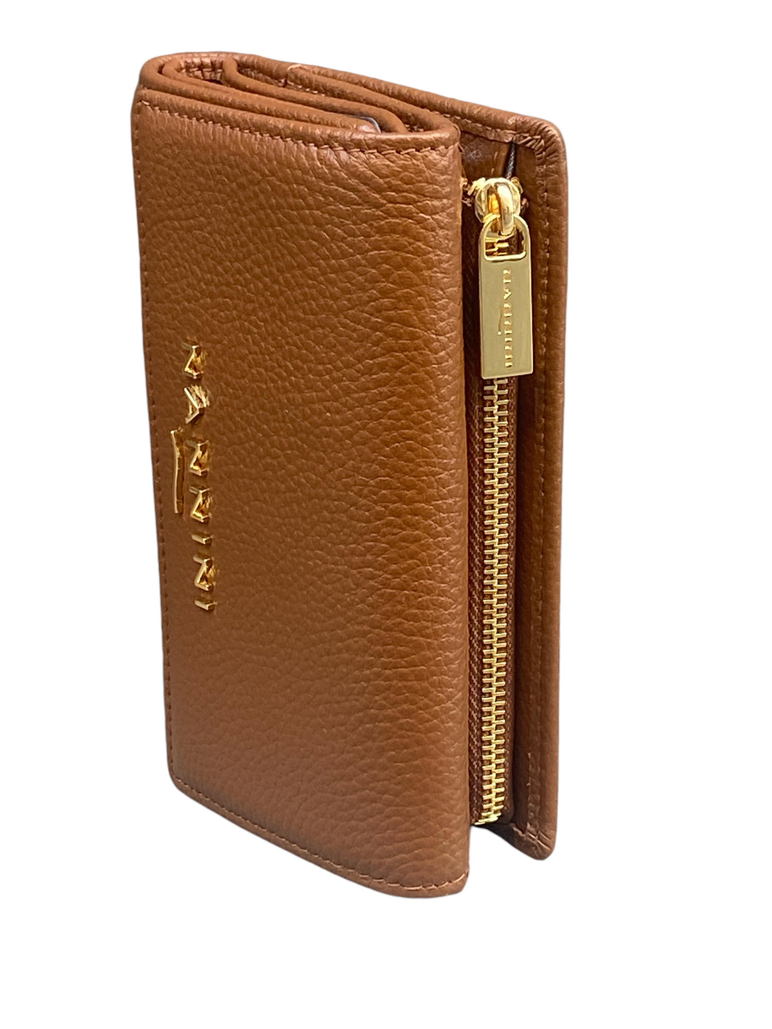 Portafoglio di medie dimensioni realizzato in morbida pelle di vitello. All'interno 10 slots per carte di credito, 6 spazi organizzati per documenti e scomparto per banconote. All'esterno comodo portamonete con divisorio chiuso con zip.
