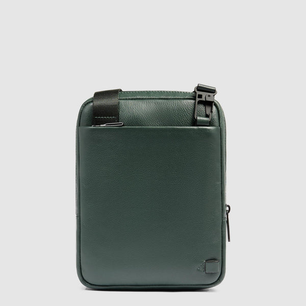 Borsello realizzato in morbida pelle di vitello con 2 tasche esterne, una frontale, l'altra sul retro, entrambe chiuse con zip. All'interno tasca imbottita porta iPad mini/mini2/mini3.