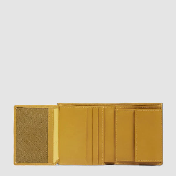 Portafoglio verticale realizzato in morbida pelle di vitello, con porta monete, porta carte di credito ( fino ad 8 grazie alla pratica ribaltina) e scomparto per banconote. Le fodere di questo portafoglio sono dotate di sistema antifrode RFID per la protezione delle carte contactless.