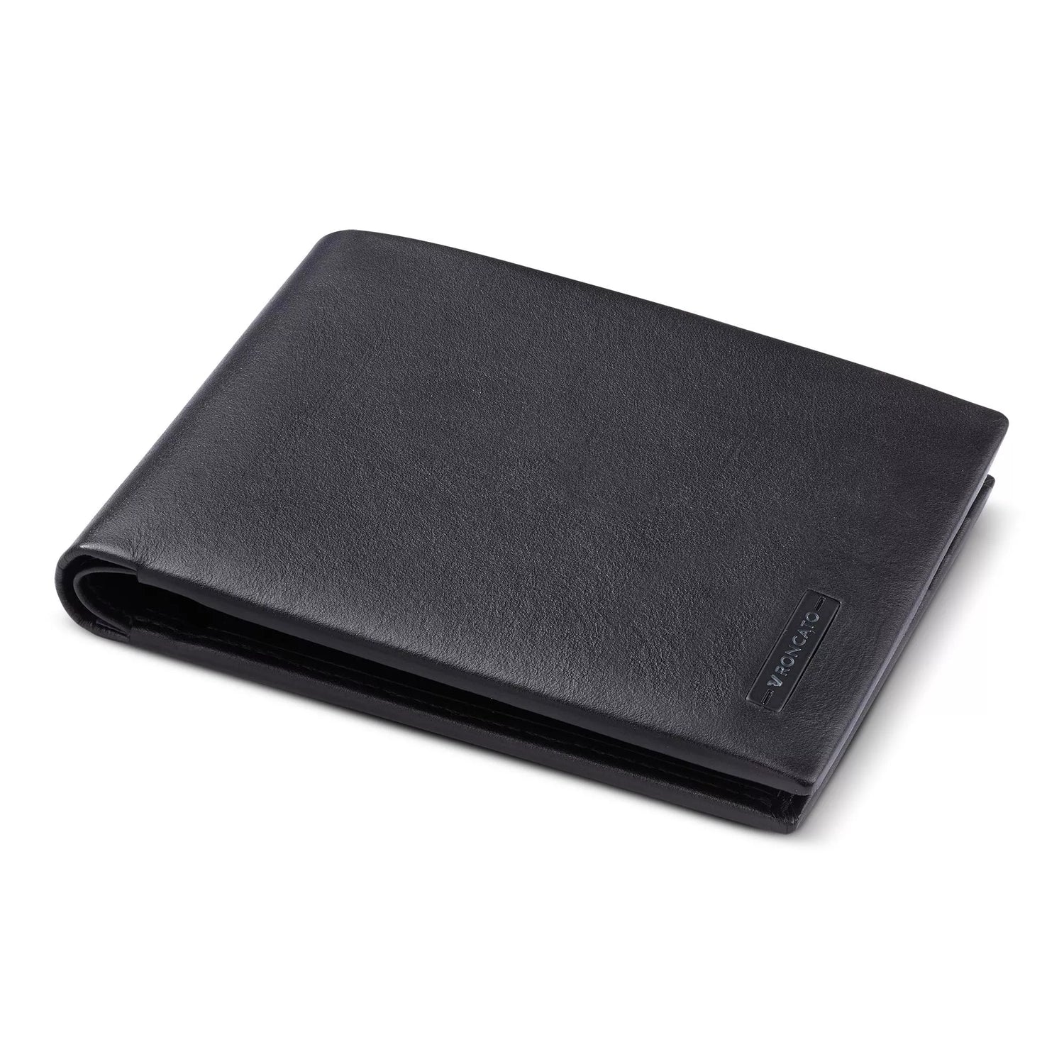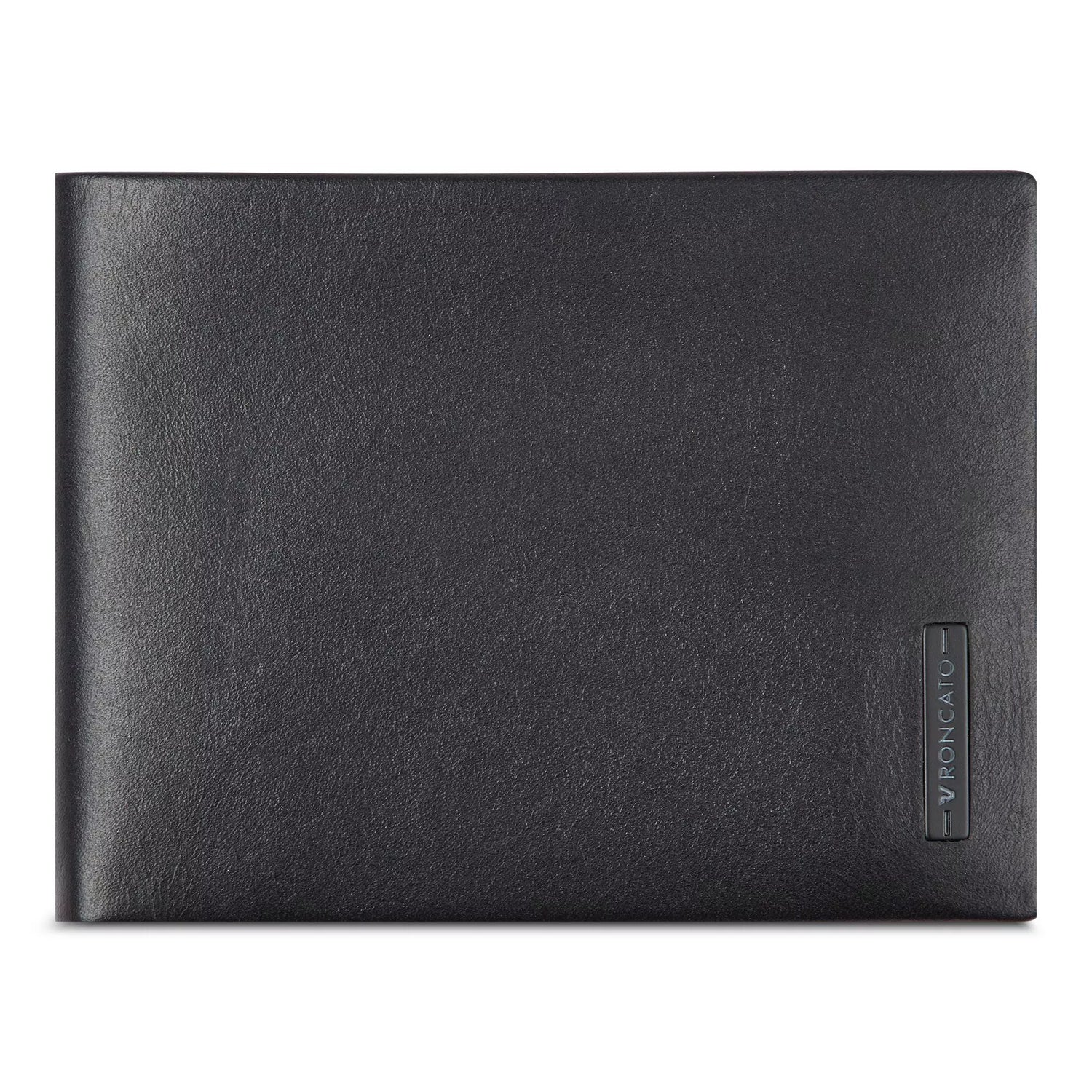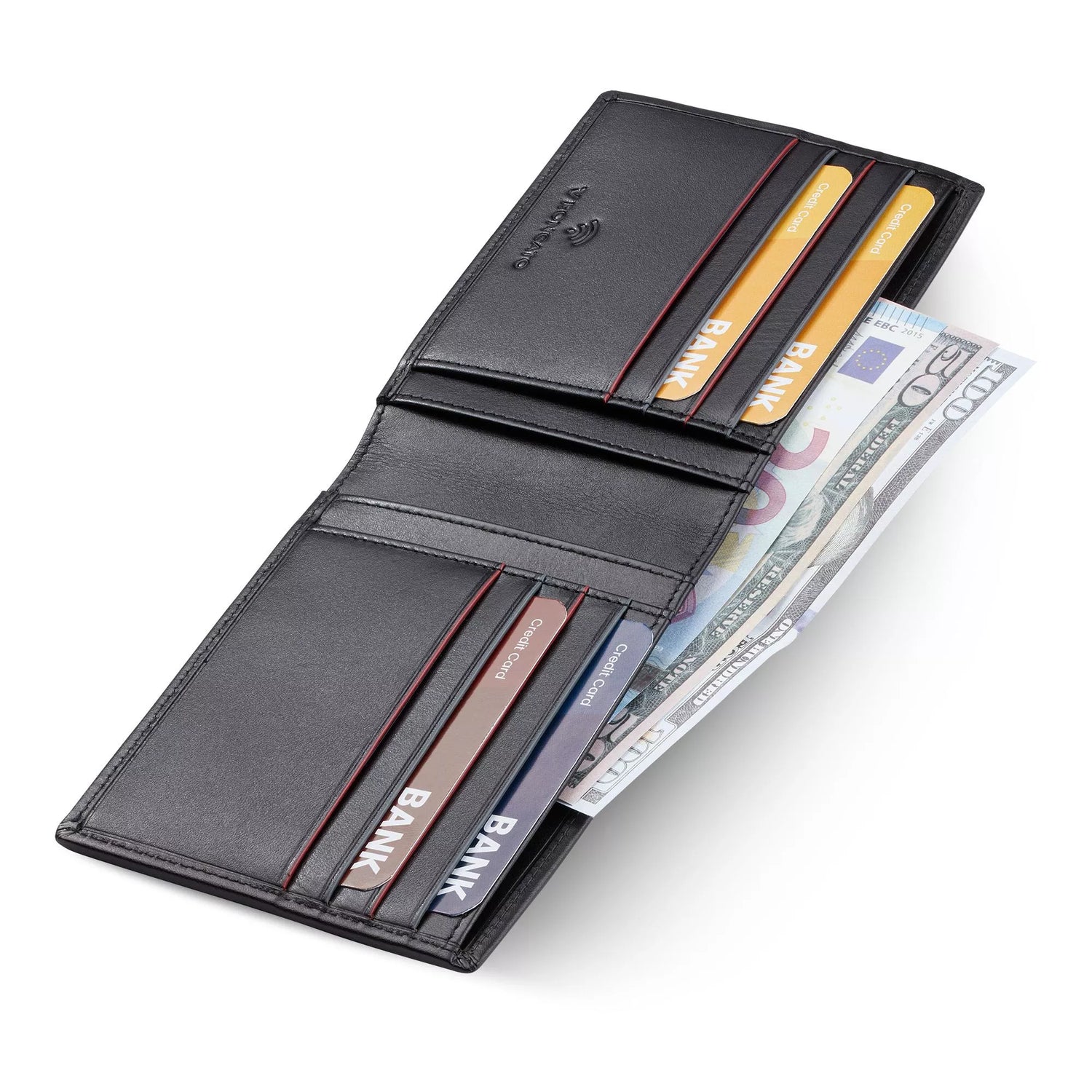 Portafoglio compatto realizzato in morbida pelle di nappa. Otto slots per carte di credito, 4 spazi per documenti e porta banconote con divisorio.