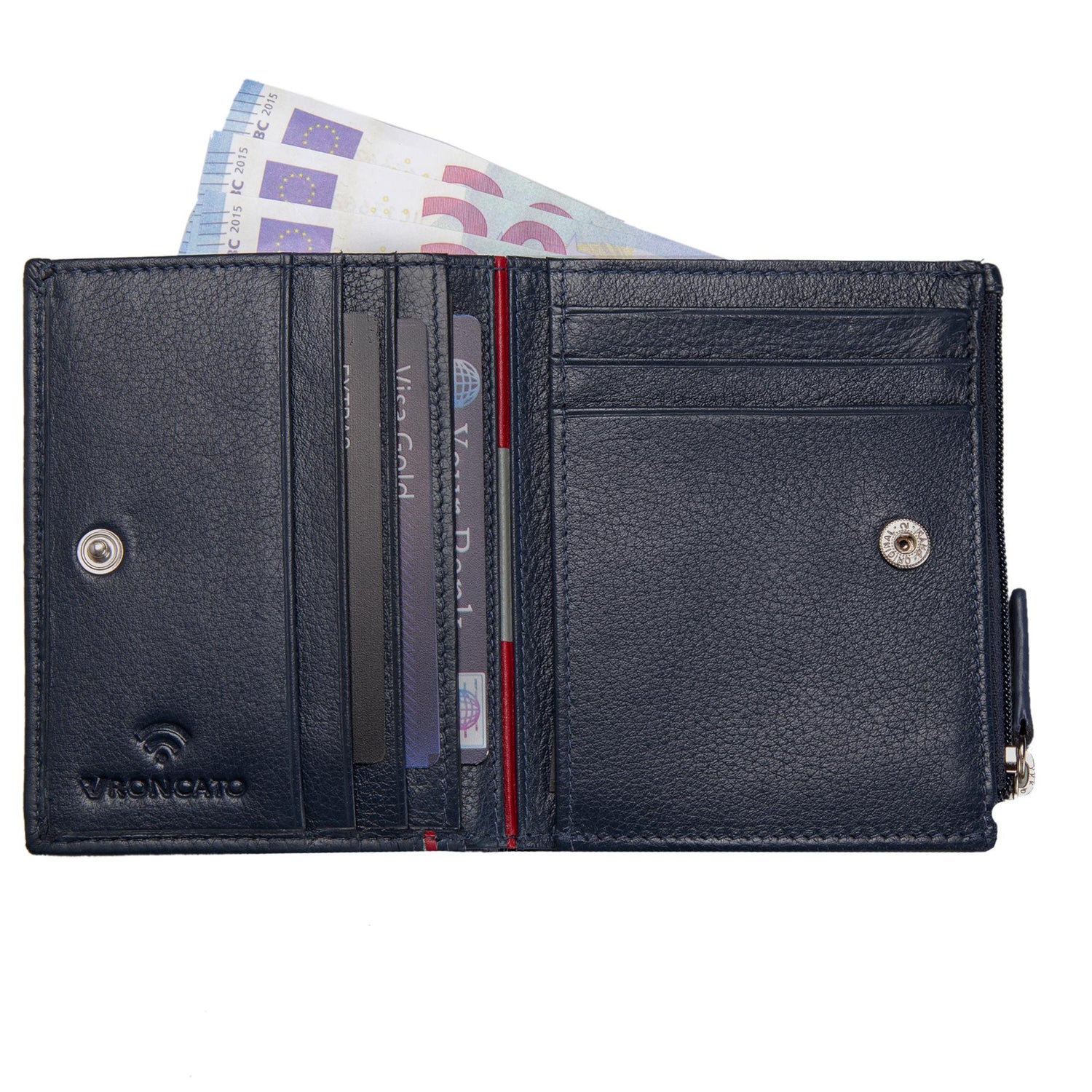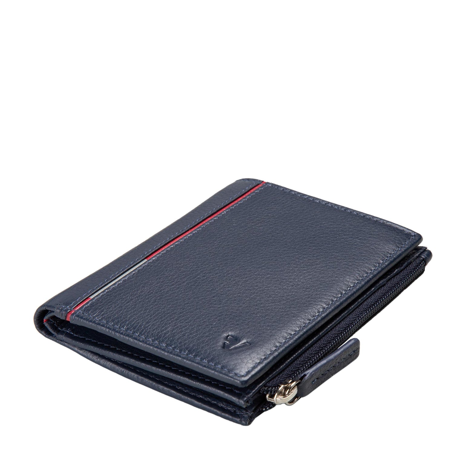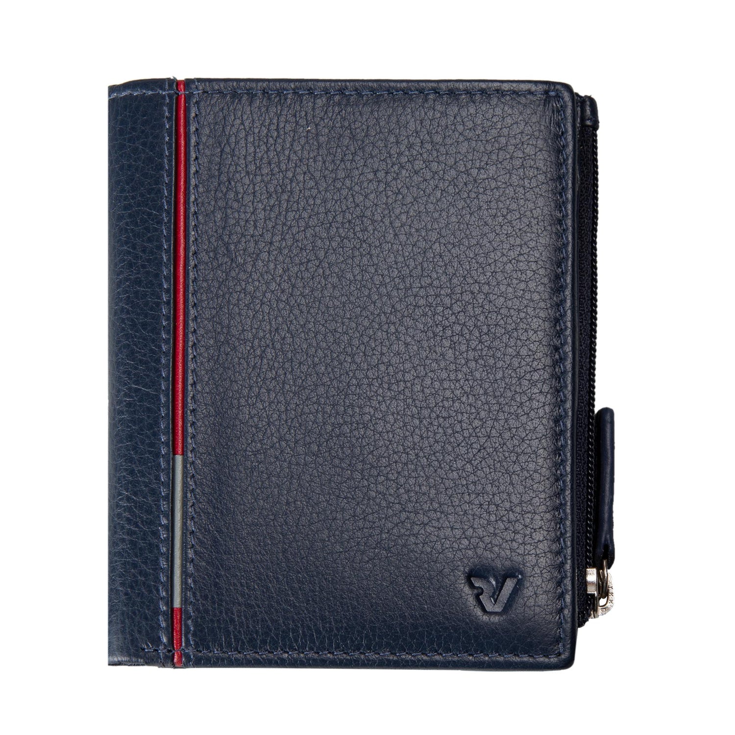 Portafoglio verticale realizzato in morbida pelle di nappa con 4slots per carte di credito, 6 slots per carte di credito, 2 spazi per documenti, tasca porta banconote e zip laterale per monete. All'esterno profilo in contrasto di colore (rosso). Chiusura a clip.