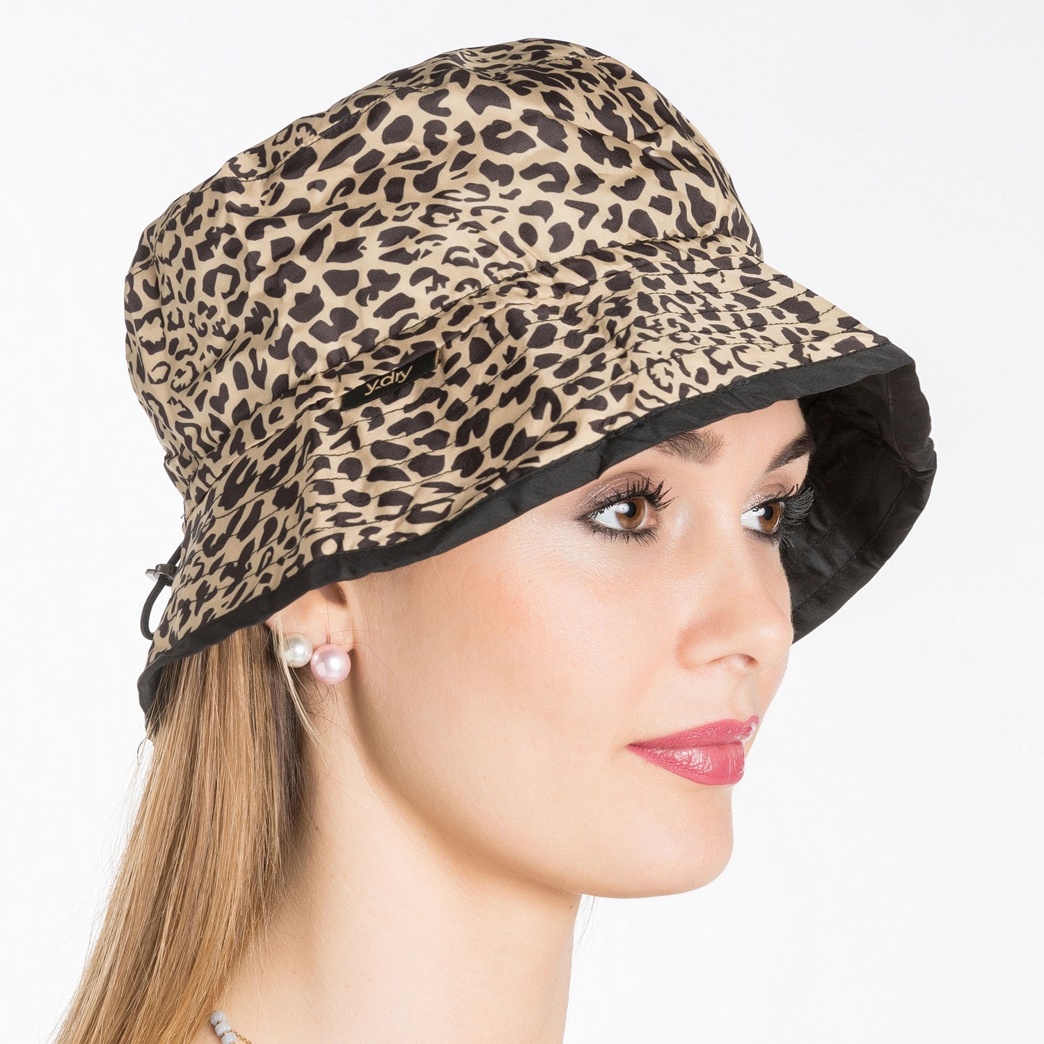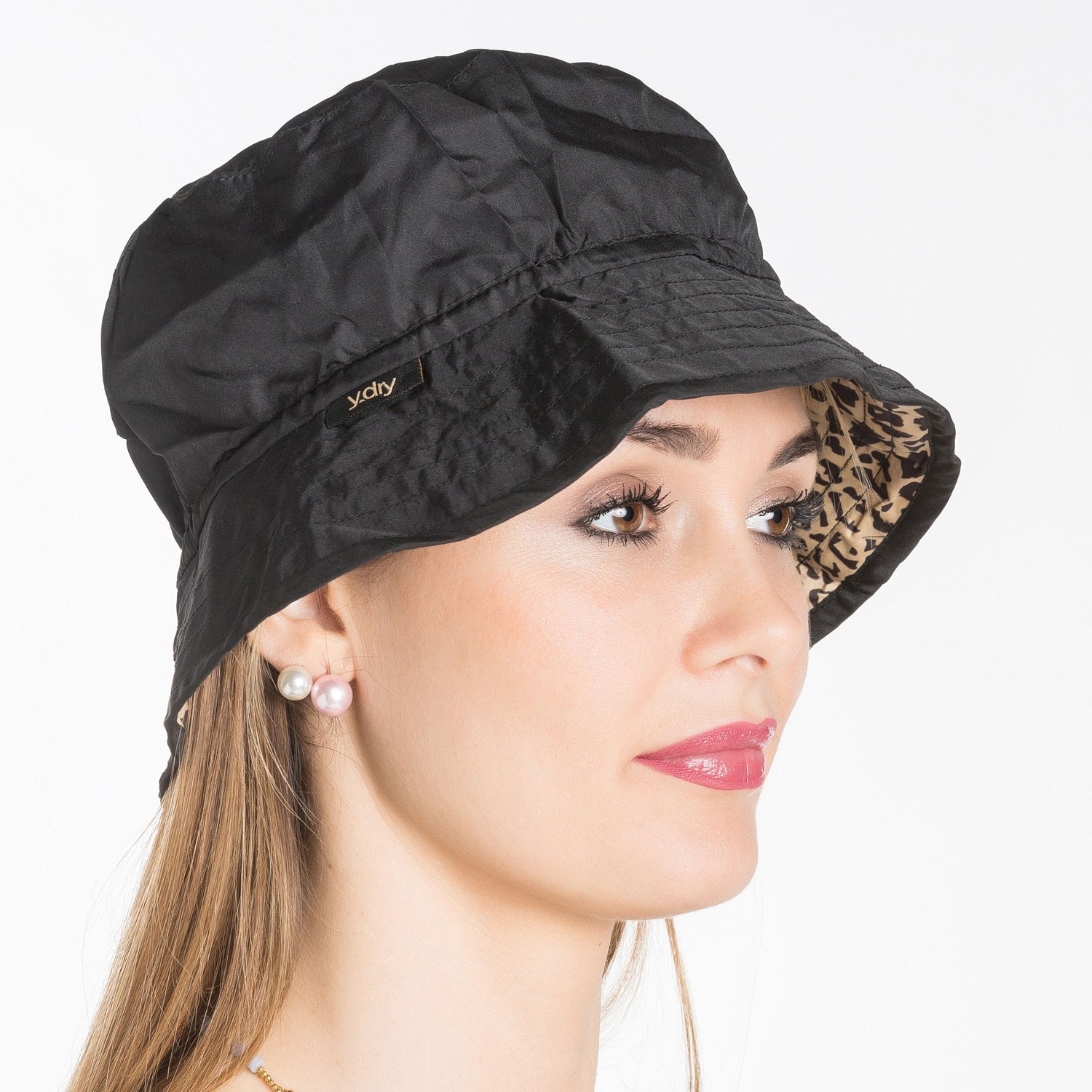 Cappello reversibile e impermeabile: Con trattamento antipioggia che rende il cappello completamente impermeabile. Cappello morbido e destrutturato con doppio tessuto e coulisse regolabile che fonde eleganza e praticità. E’ caratterizzato da una forma distintiva a secchiello, una corona morbida e una tesa rotonda di 6,5 cm con cuciture. Il tessuto antipioggia con cui è realizzato lo rende una scelta pratica e versatile che offre una combinazione di resistenza e comfort. Il capello (double face) ha due possibilita' di scelta colore, fantasia animalier e tinta unita nero.